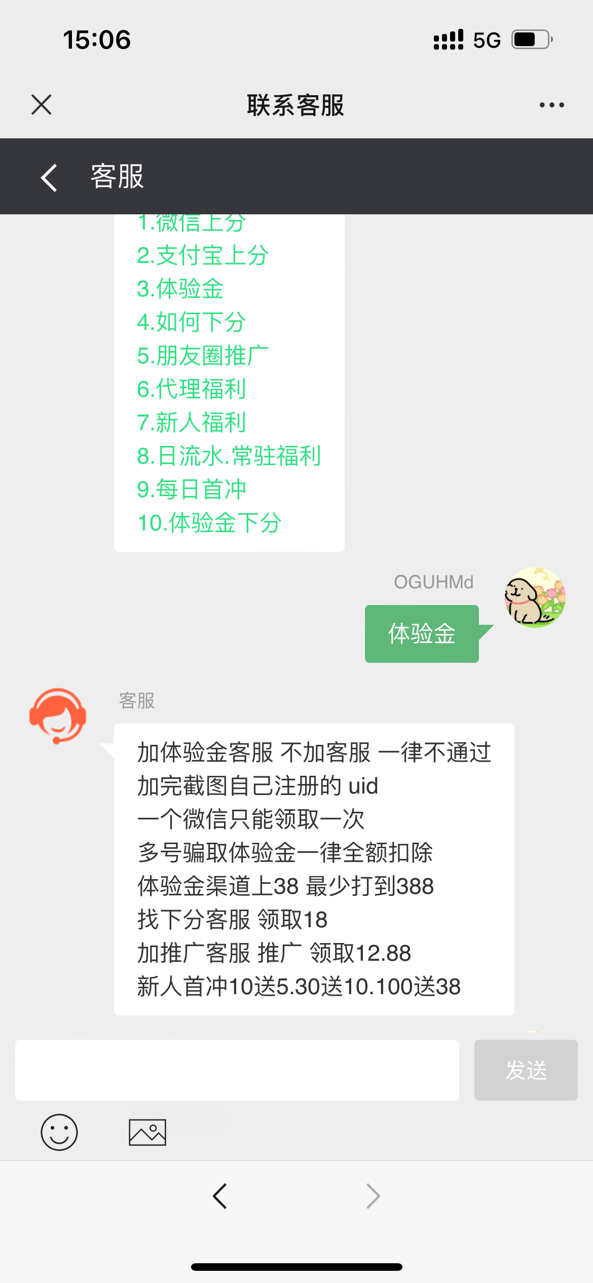 微信扫码找在线客服加微信截图uid 然后充值的地方选体验金通道提交38