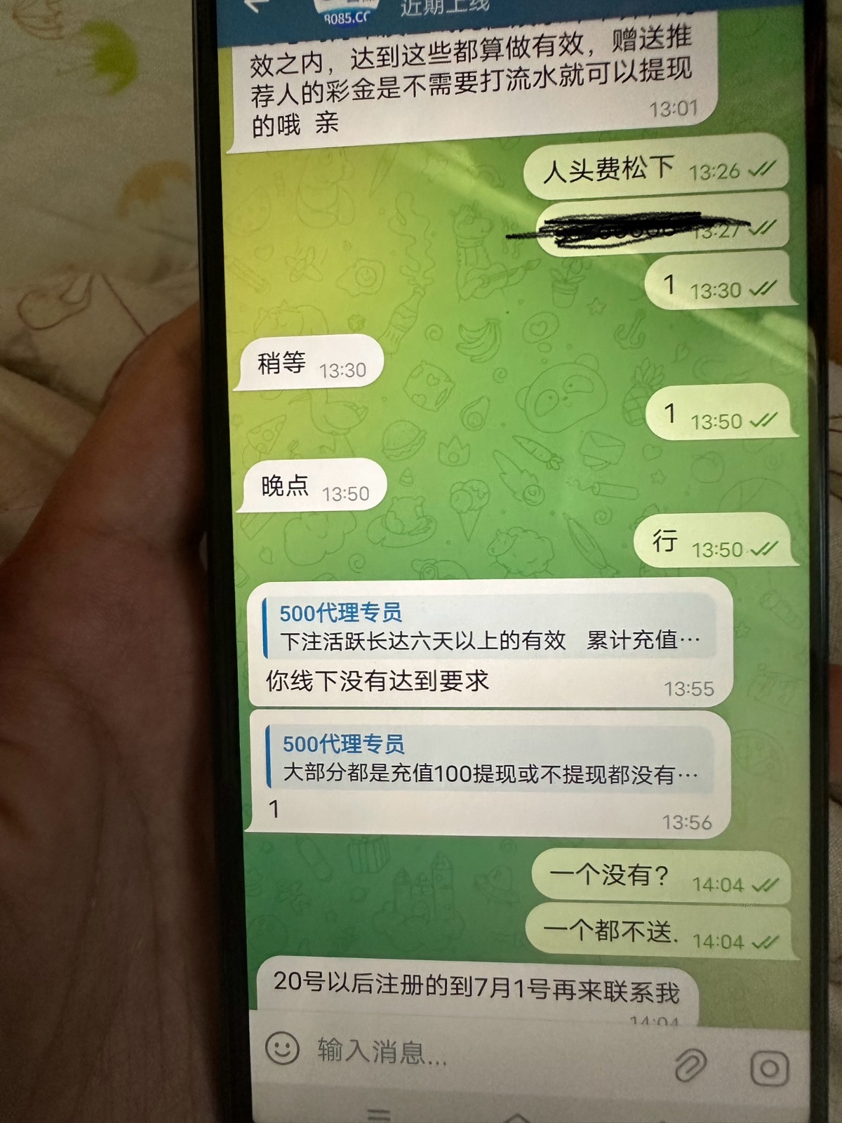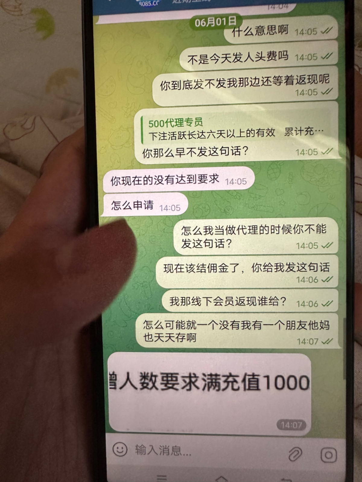 我刚开始推广的时候他就没给我说那个要求,等我该接人头费去了,他跟我说一堆要求说我先下什么各种不符合就我知道的,我一个朋友就帮我天天存,天天存也说我不符合说白了,这种狗逼平台就是没实力,佣金都不给接,还说20号注册的,让我7月1号去妈的,平台上面写着1号金佣金跟个狗揽子似的,广大网友认清500国际黑会员黑佣金黑代理