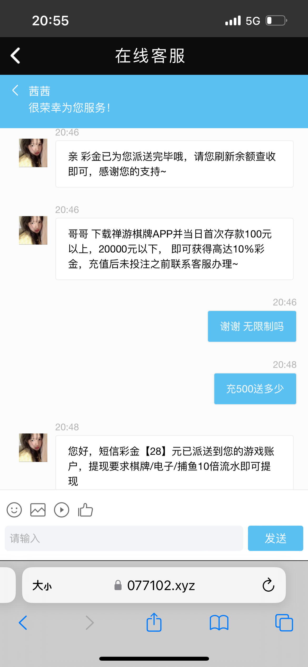 兄弟们看看有没有收到短信 有的话直接上找客服领取,我自己领到了,白嫖即可,勿充值,地址 077001.net