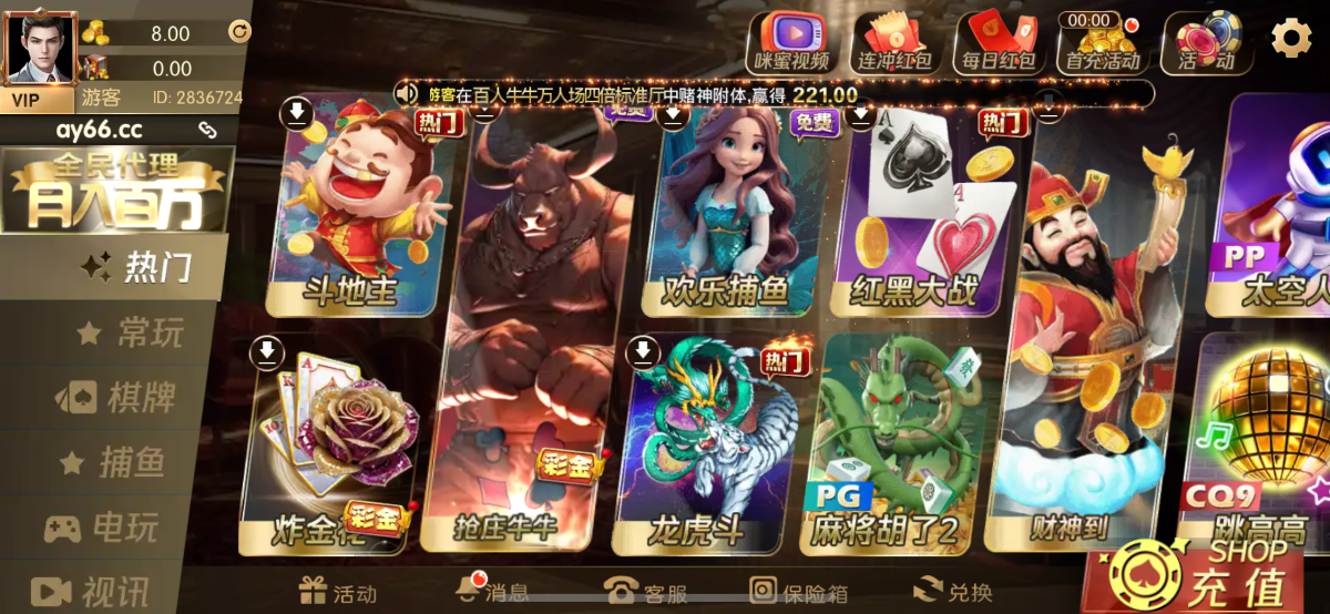 注册好 然后绑定手机号登陆秒送8彩金 最低提款100元 可以捕鱼 打斗地主