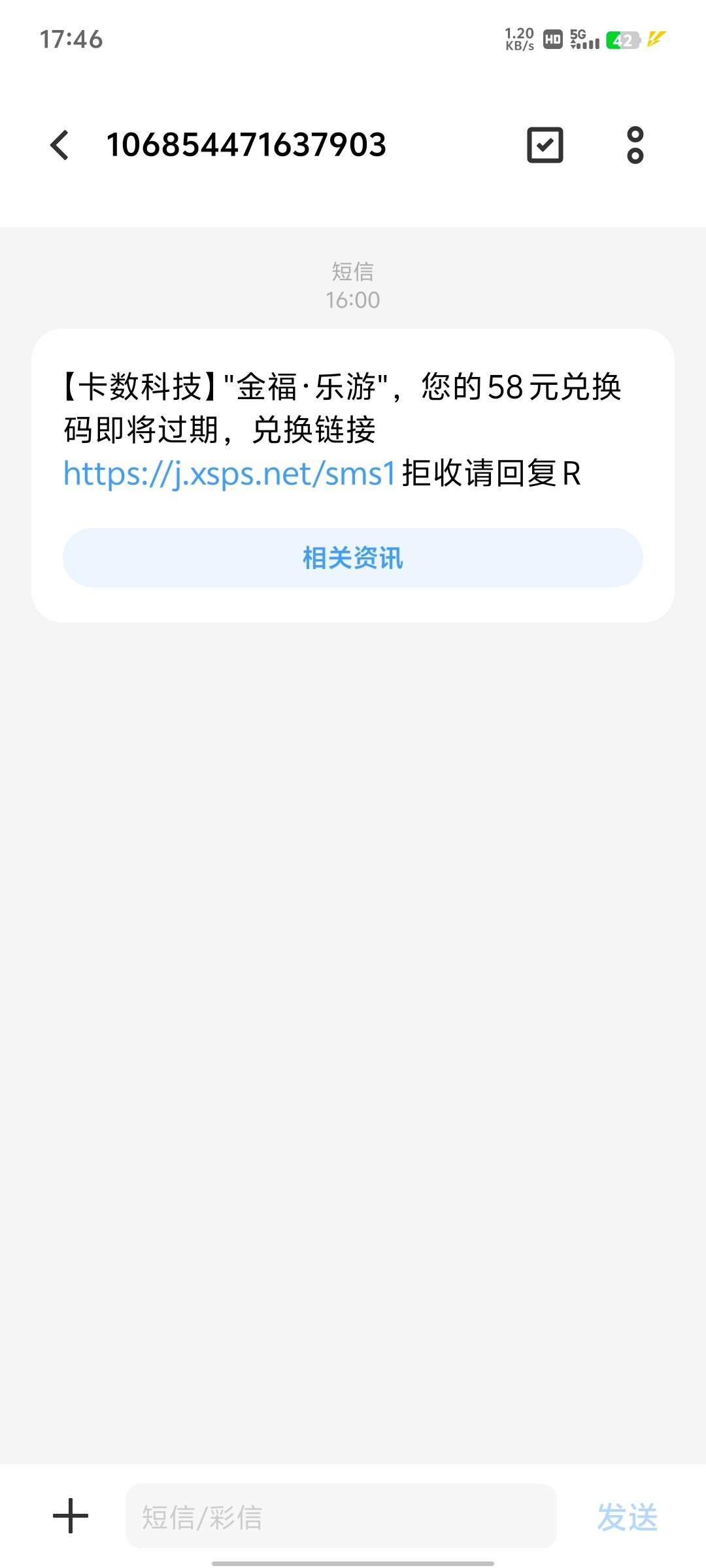 【卡数科技】"金福·乐游",您的58元兑换码即将过期,兑换链接 https://j.xsps.net/sms1 拒收请回复R