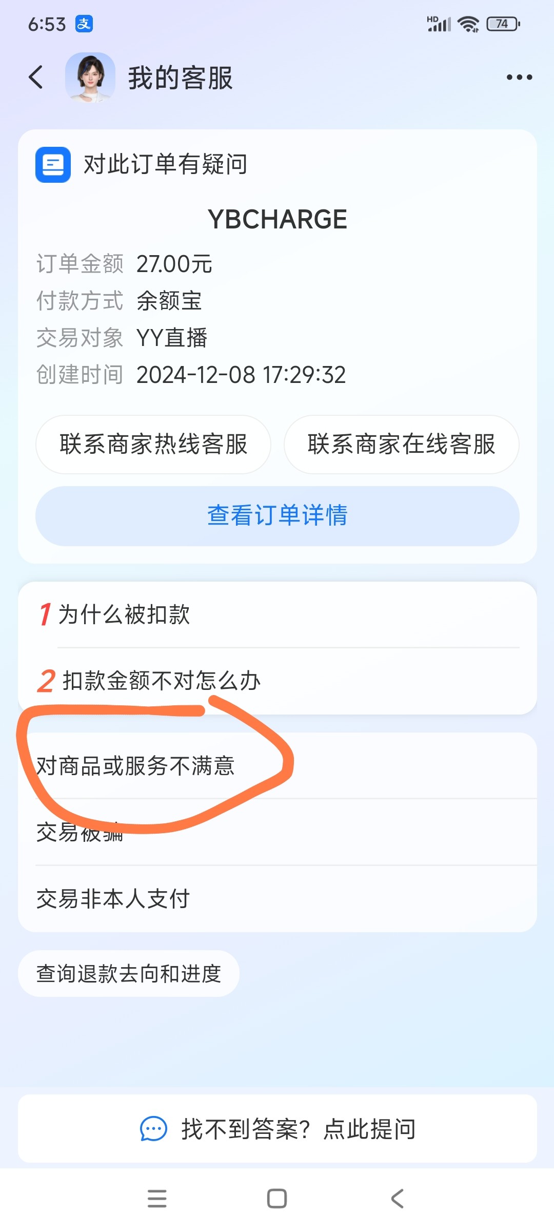 YY退款全给退了,上个月底有订单的都去试试吧,免费分享,点投诉,仅退款,未收到提供任何服务,然后等商家回复就是了。