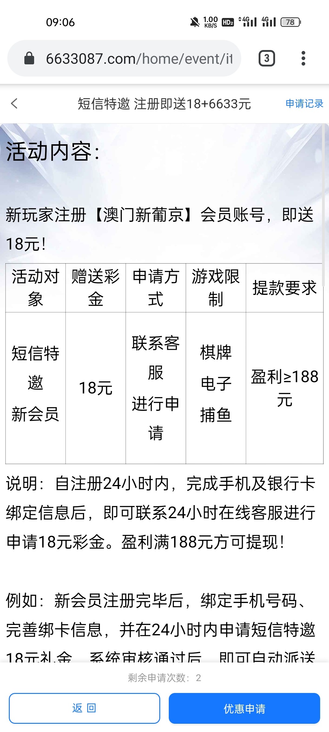自注册24小时内,完成手机及银行卡绑定信息后,即可联系24小时在线客服进行申请18元彩金。盈利满188元方可提现!