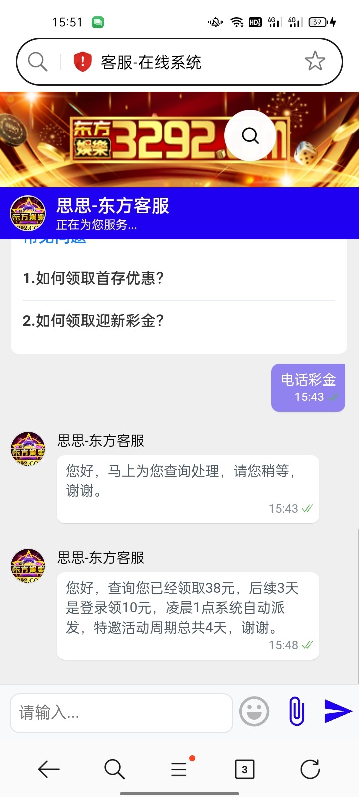 刚开始打电话送了38 没有打出来 然后每天送的10块白嫖了一百 网址是 3292.com
