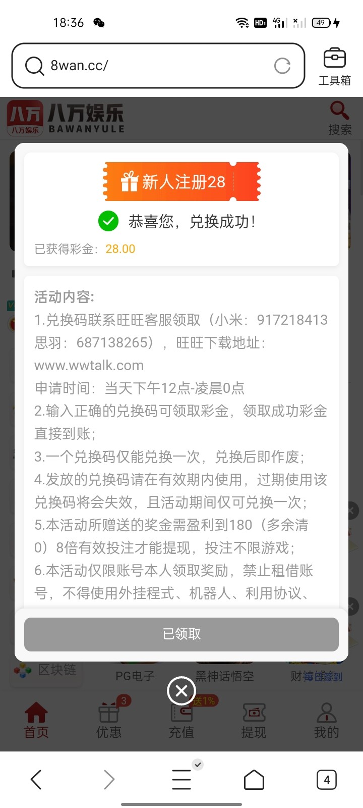 活动解除,但是可以打广告申请 我是送了 去玩AG电子一飞冲天 十分钟上了181 直接提了,五分钟左右秒到了