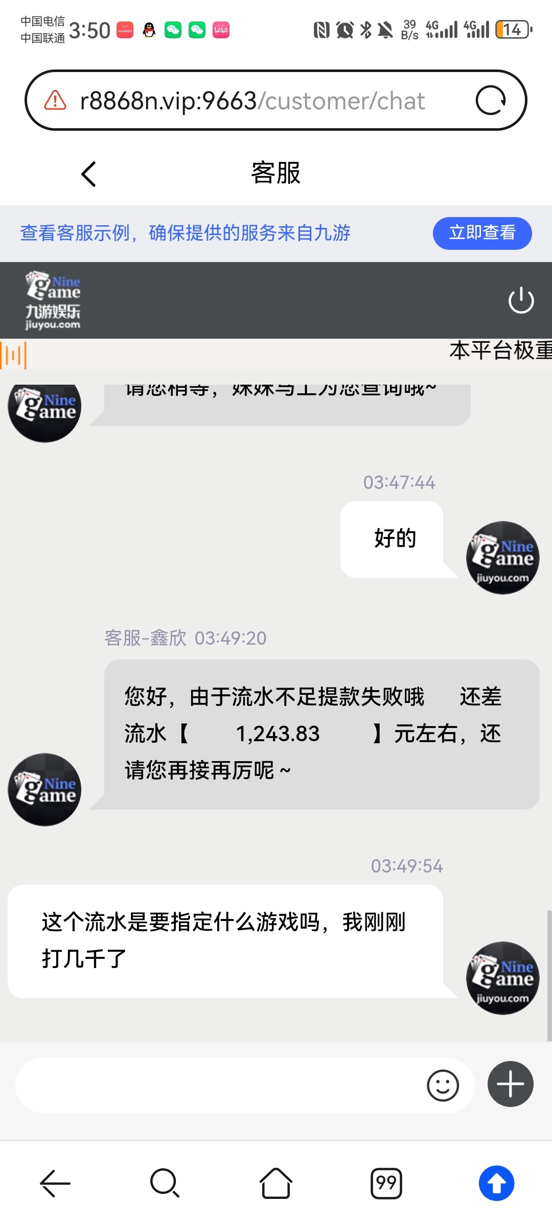 之前充过几百一次没提过,然后昨天领了那个158的回归彩金打到了1700各种理由不给出最后直接说要我充值100然后打1800的15倍流水,然后我找送彩的app客服说半天才出了三百,然后就叫我充值,我充了一百跟剩下的打了只剩600多了,我就提600结果直接封号,我一直在拉电子说我违规操作纯大黑笔,玩不起别玩