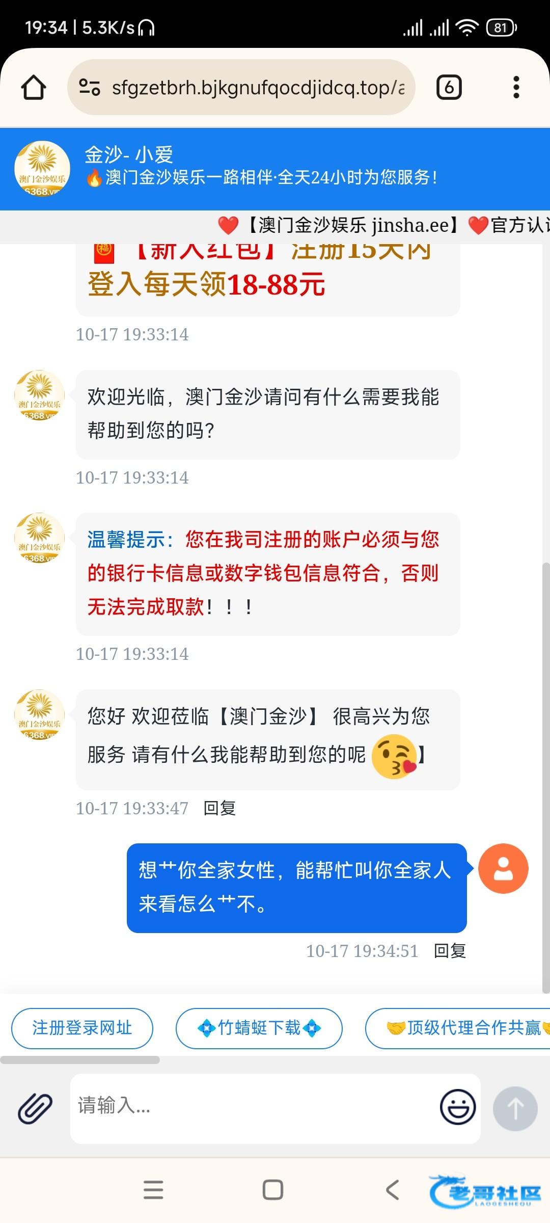 ,说回访送88,一打开就是个客服页面,一直让下载APP,下载以后就让你他妈充值,让你充100送88,后面我想了一下,好像之前也接过这个电话,当时说的是注册送88,最近这种套路台特别多,都是骗注册的,老哥们接到注意一下