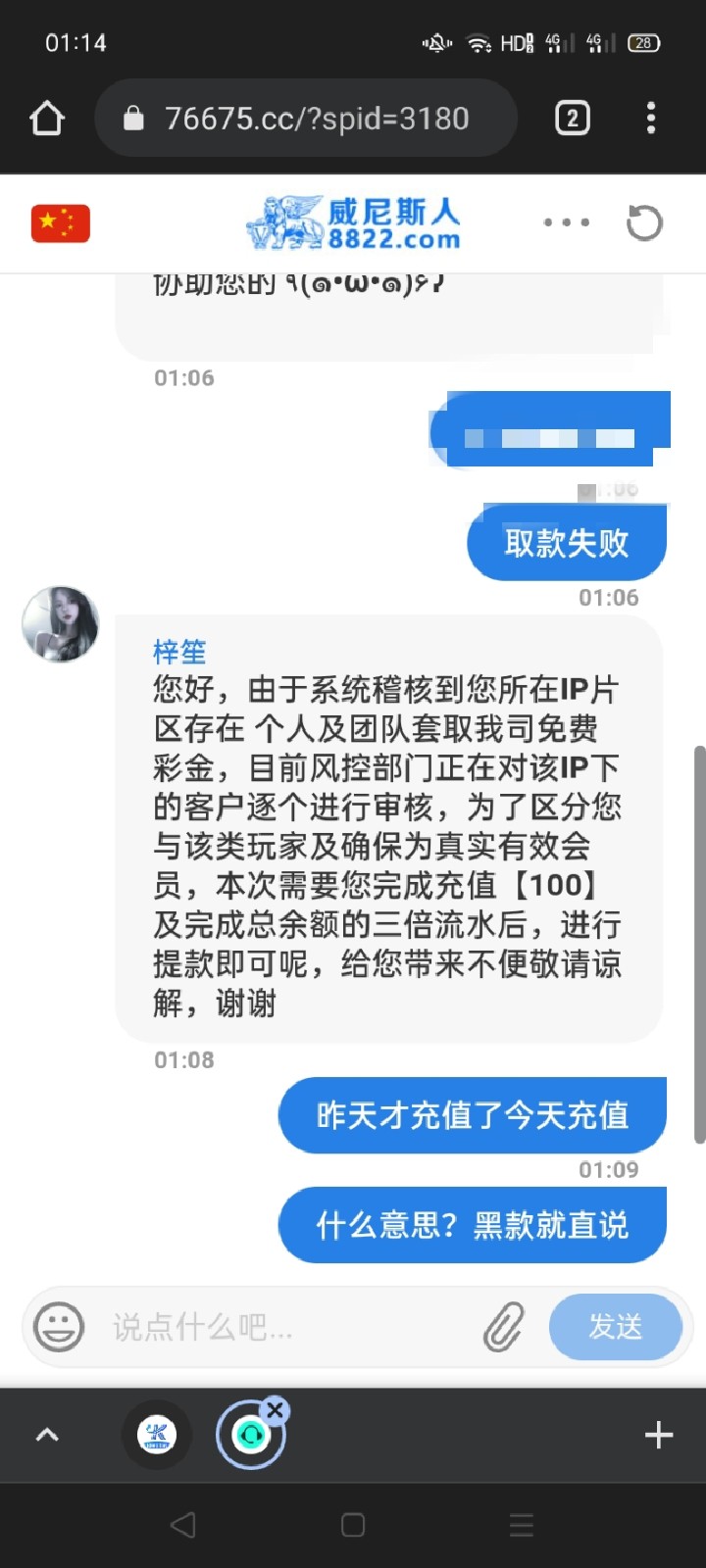 昨天签到要6块钱我打300多流水,出款了188然后充值200爆了直接扣除盈利,今天签到又要我充值,傻逼才玩这个台子?