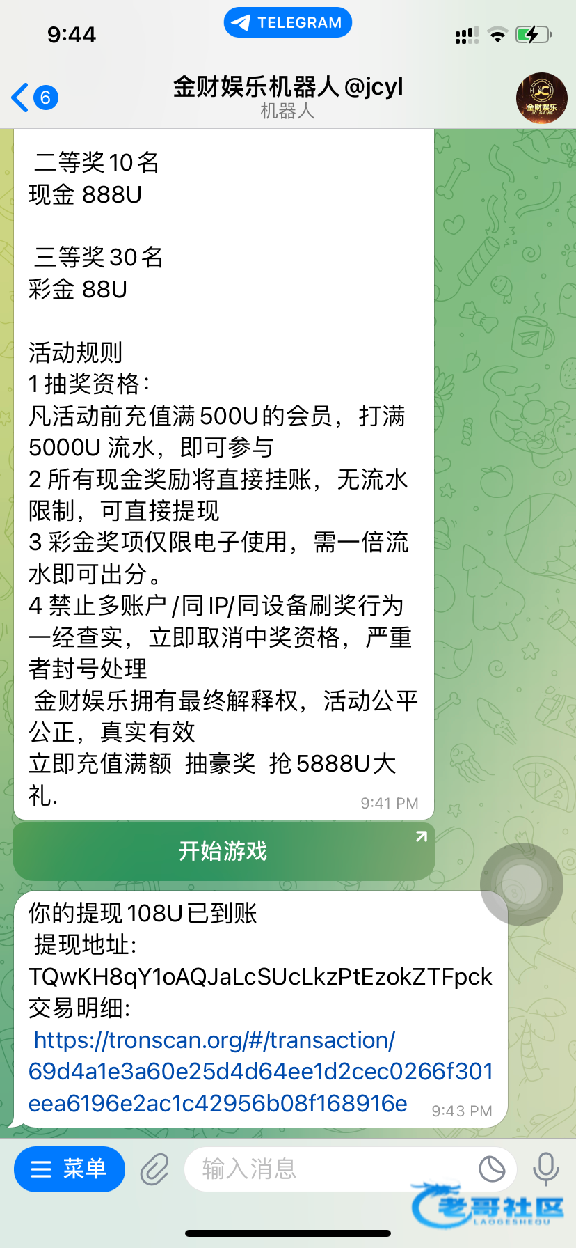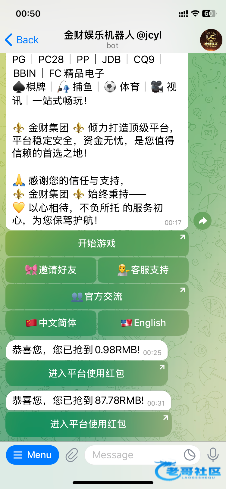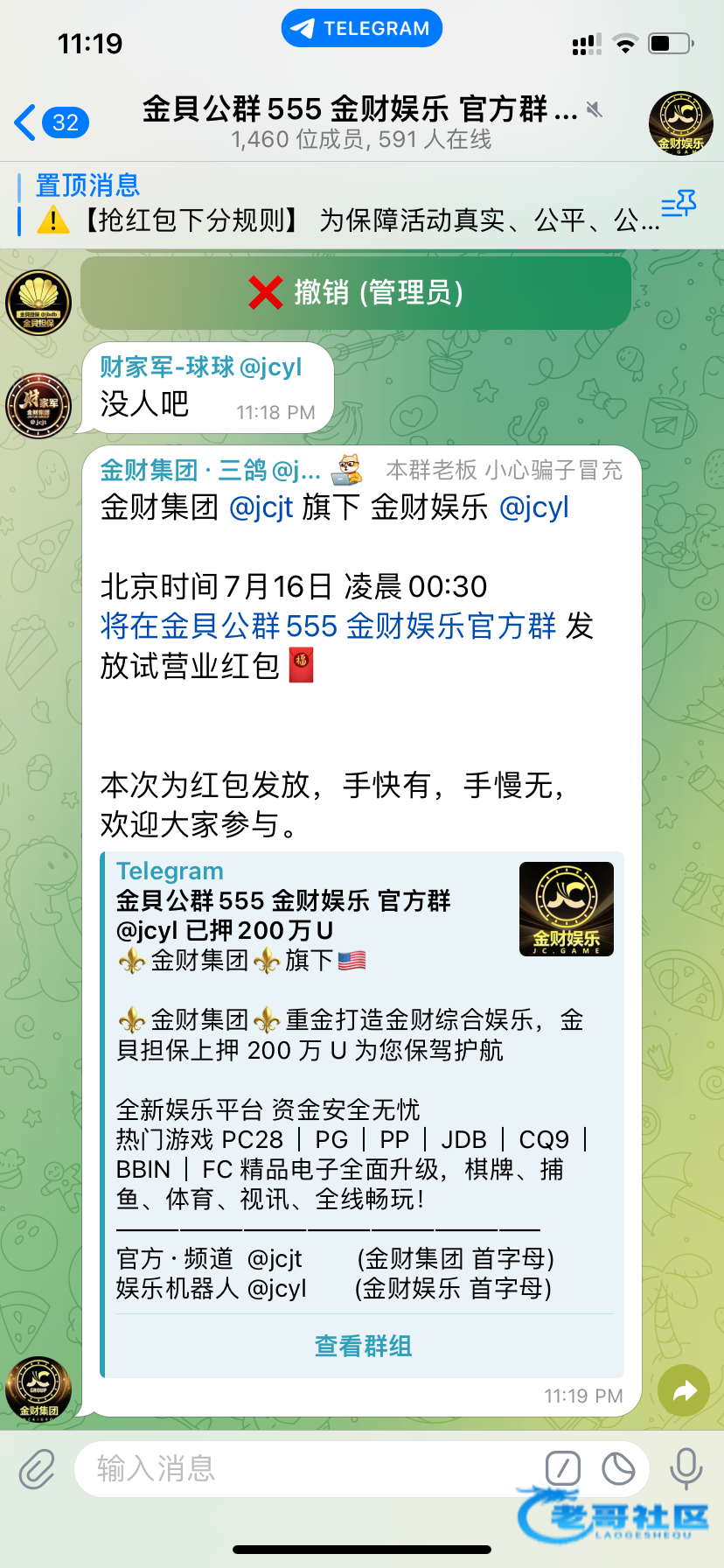 这几天开业会发红包各为老哥可以去看看 和金贝 天胜 一个模版 应该不是发假包 在金贝上有押金 官方频道 @jcjt