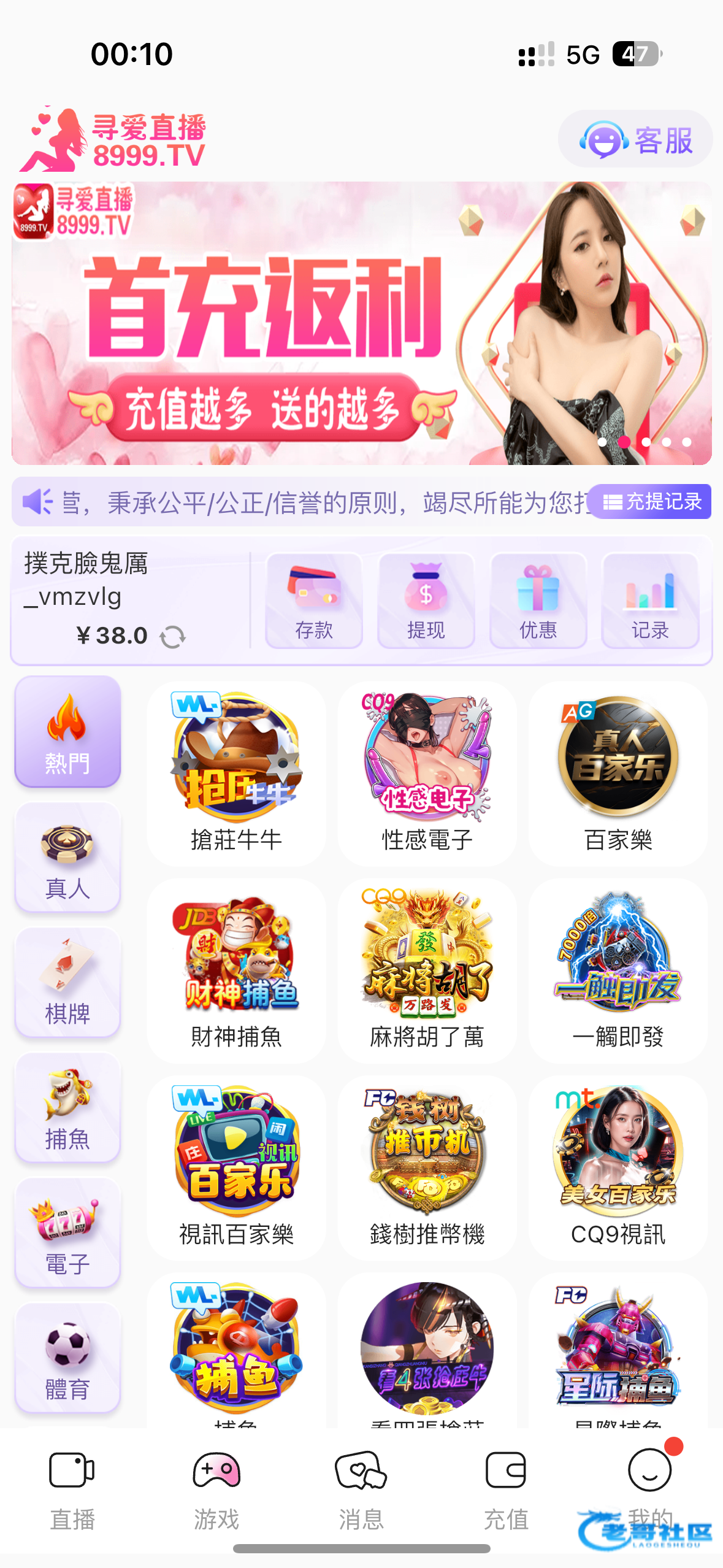 送了38,财神捕鱼一块场一分钟上四百五然后挂壁。