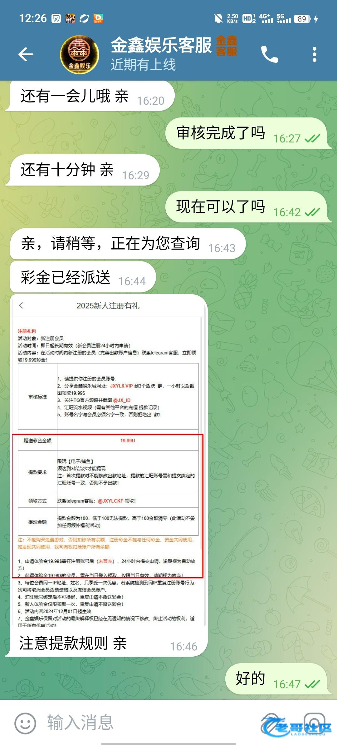金鑫娱乐城联系飞机客服@JXYLCKF,按照客服要求注册,我欧意流水也给了,最高最低100u,我没打出来