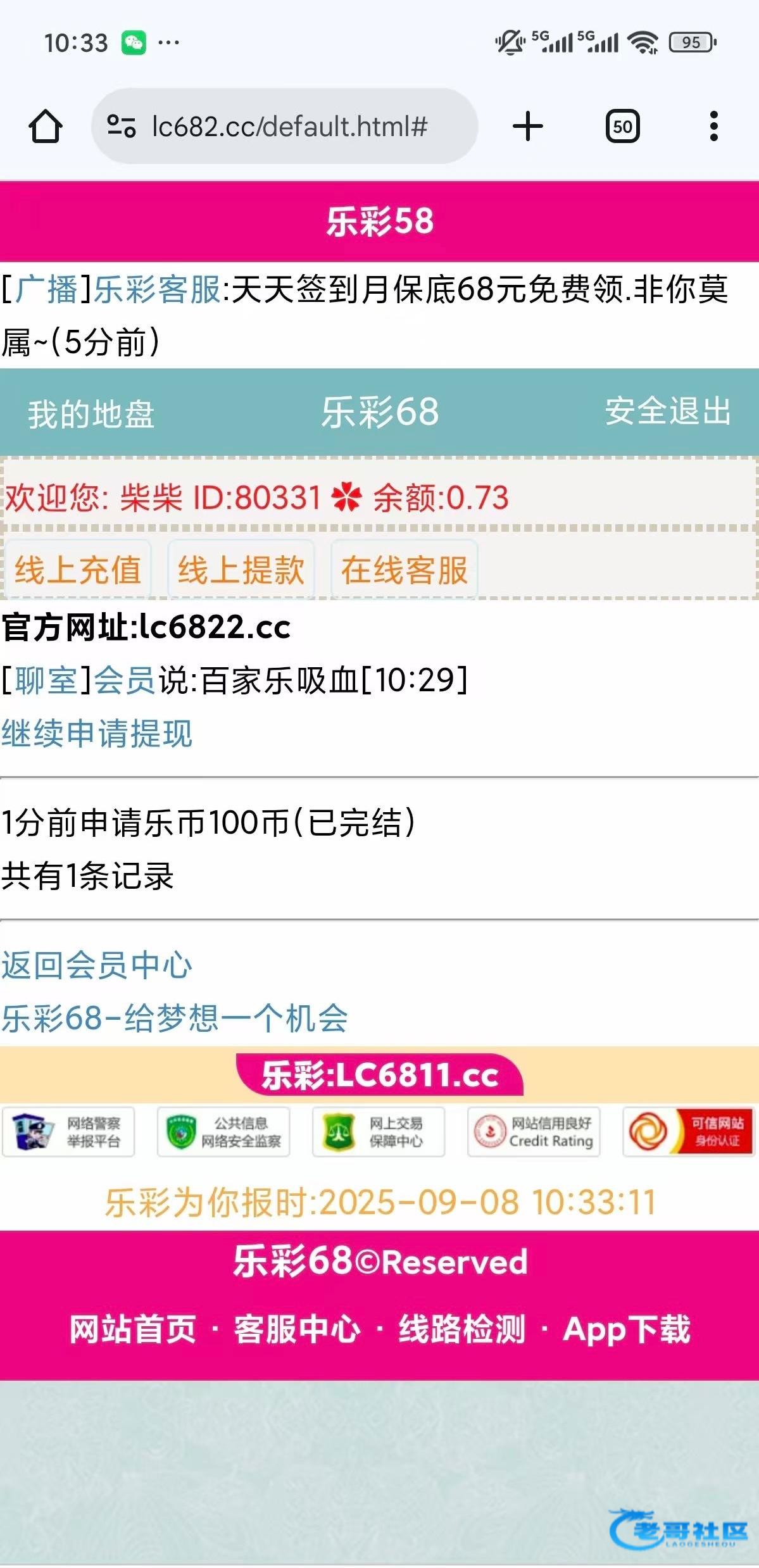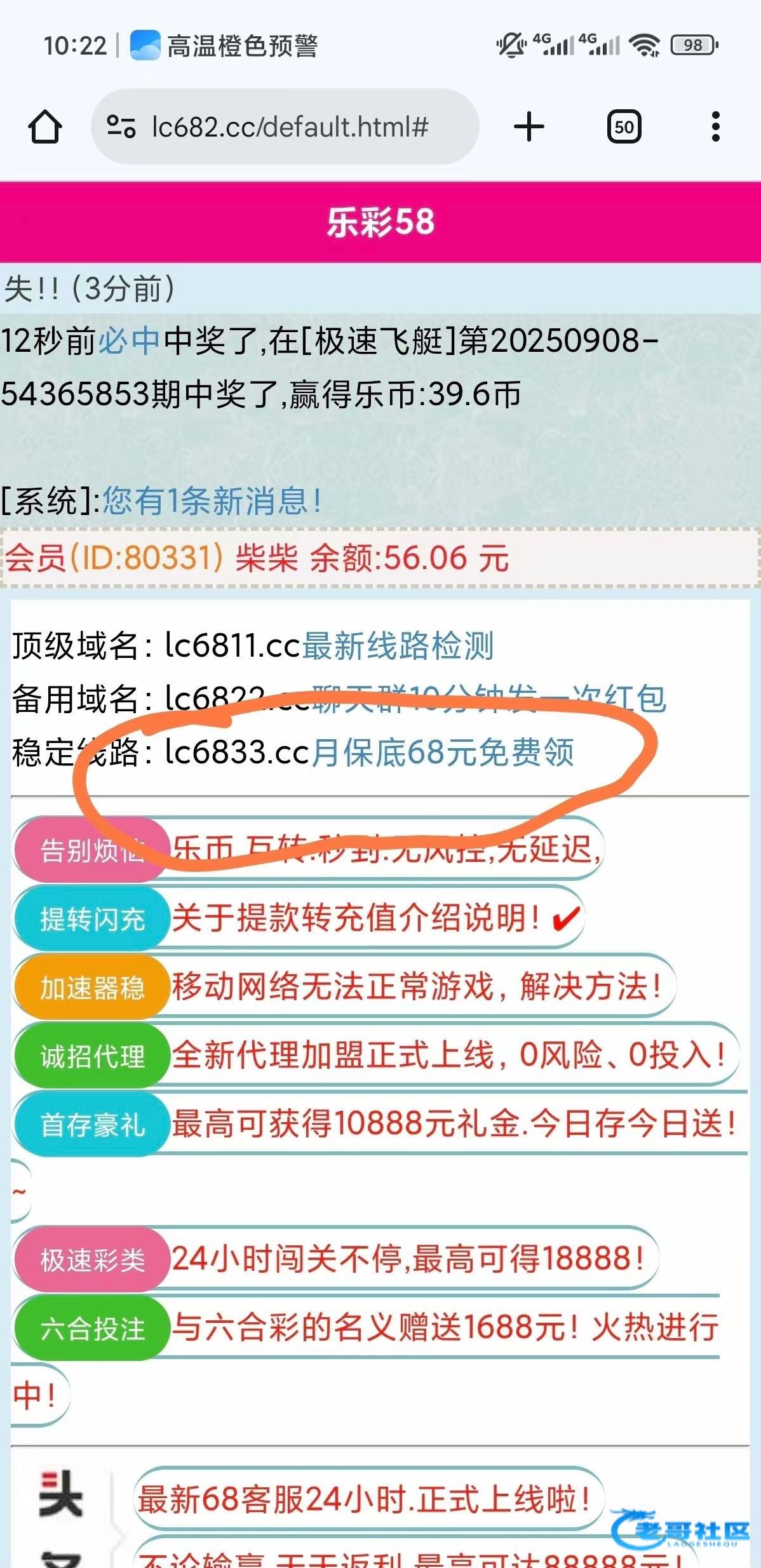乐彩新用户注册送18 118提 老用户填写红包码给8 好像签到还有2 不知道在哪 (我画红圈位置输入 369147领取) 100提秒到 刚提k豆1分钟到账 红包码的8每月8号才有lc6811.cc lc6822.cc lc6833.cc