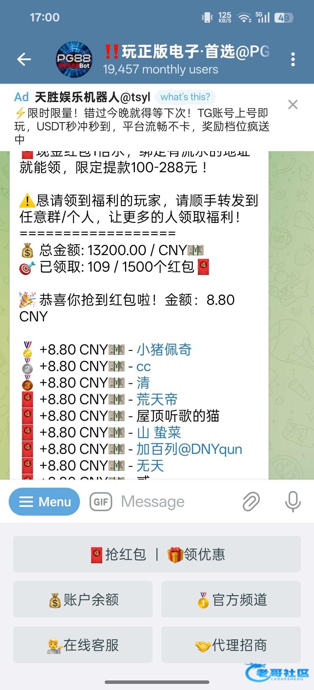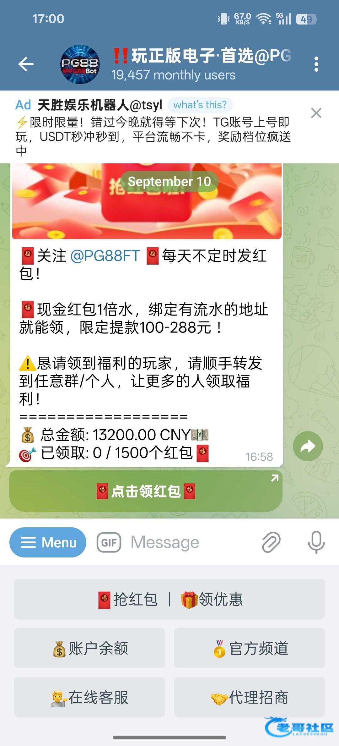 飞机关注机器人@pg88,1500个8.8红包