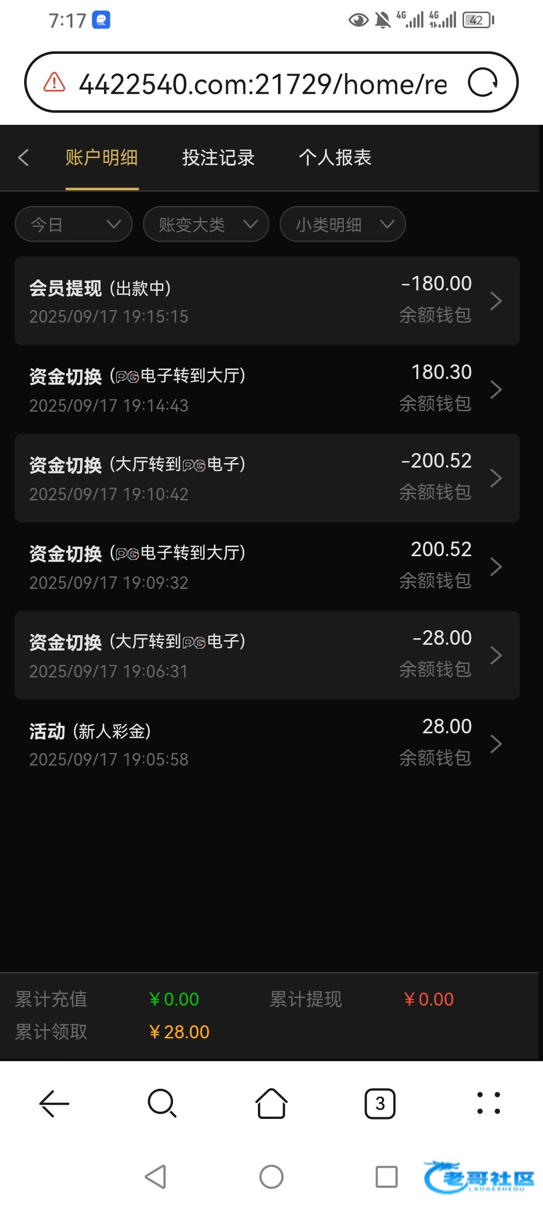 今天彩金3个都打到一百了有一个贪了一个黑脸一个不够五把这个28点了四下就进了0.8给了178.8流水不足提了180到了