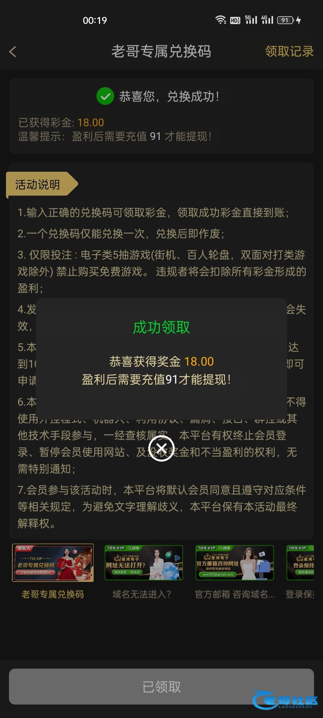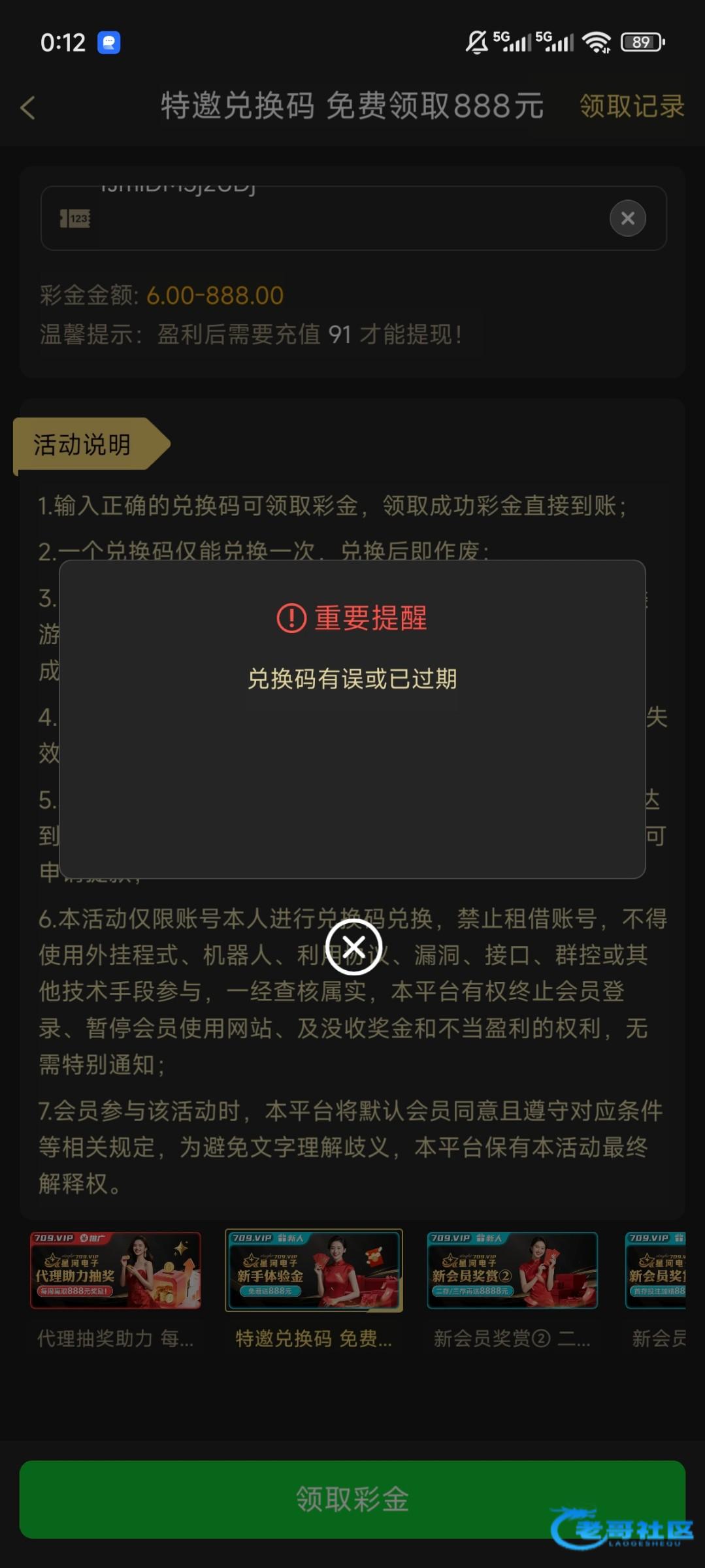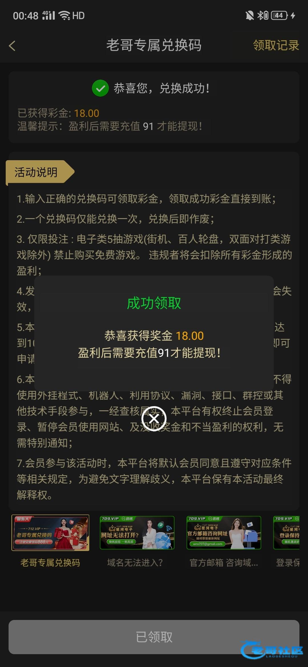 在论坛商城自助拿代码-代码在平台活动-资讯-老哥专属彩金兑换,领了此代码不能再领新人的不然封号,领到的反馈下