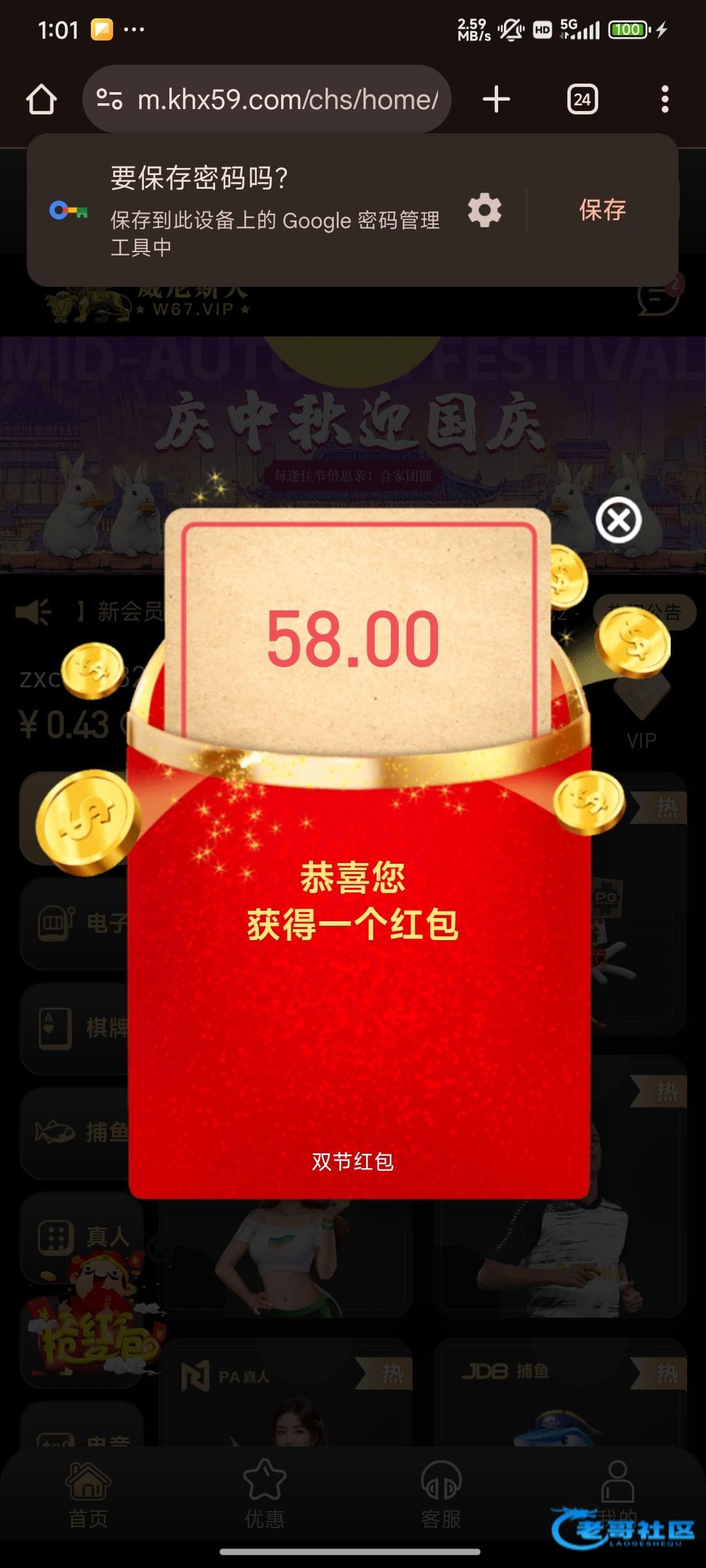 送了58,估计要充值过的,这台半黑,w67.vip