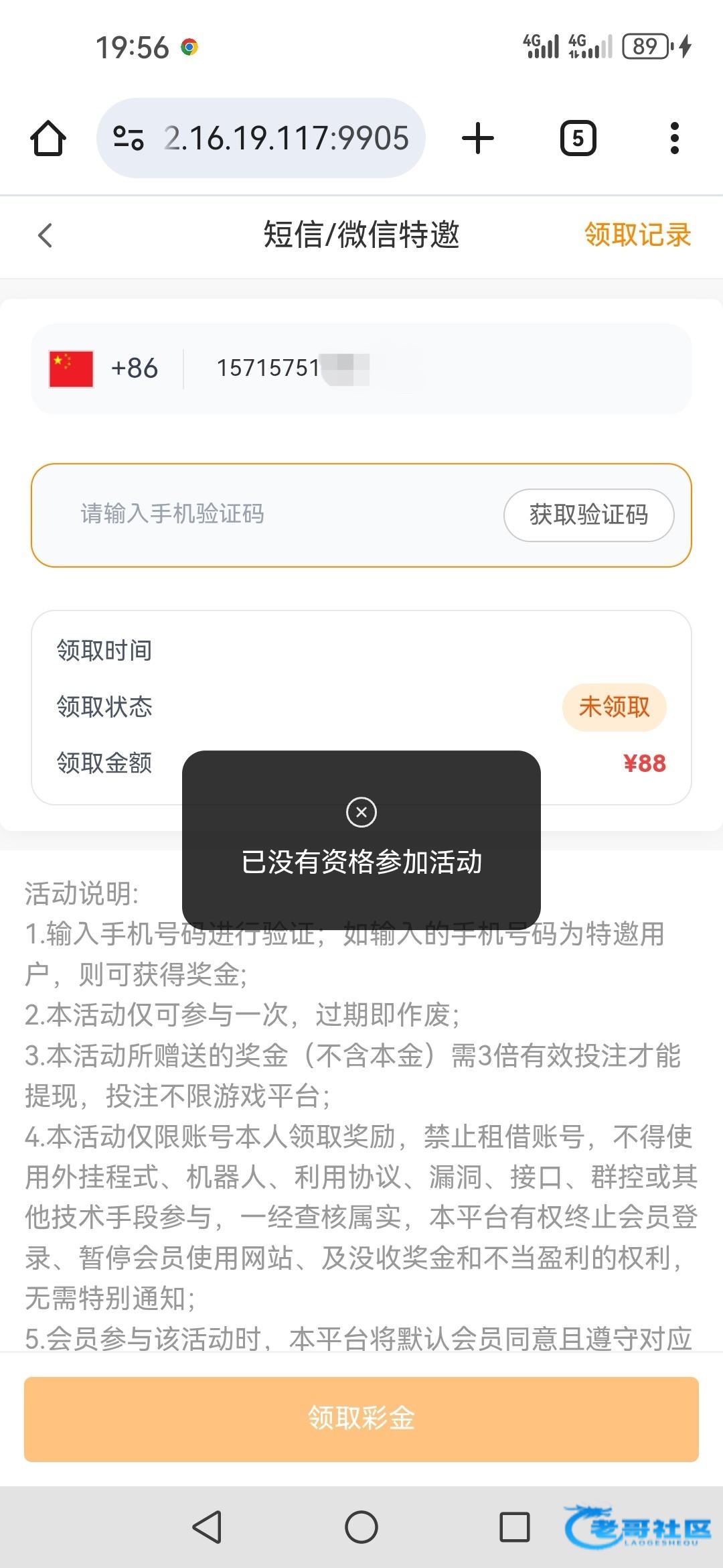 郁闷有88未领取,输入验证码又没资格