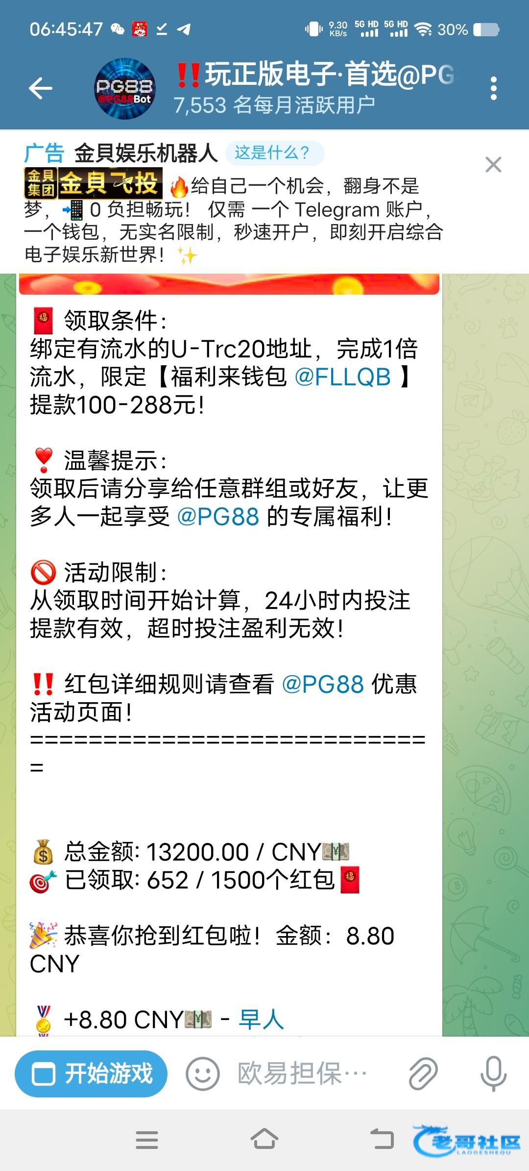 又发红包了 飞机关注机器人@pg88,1500个8.8红包