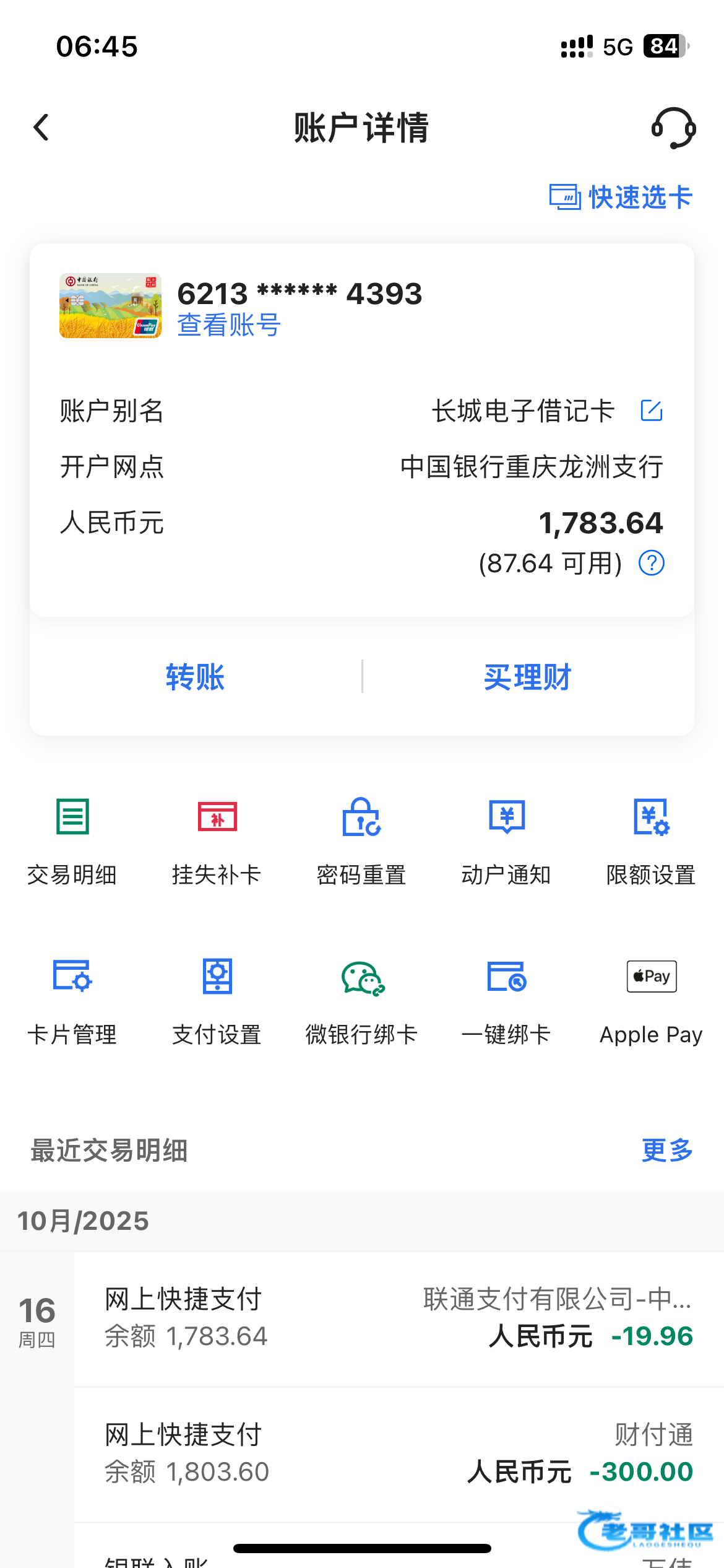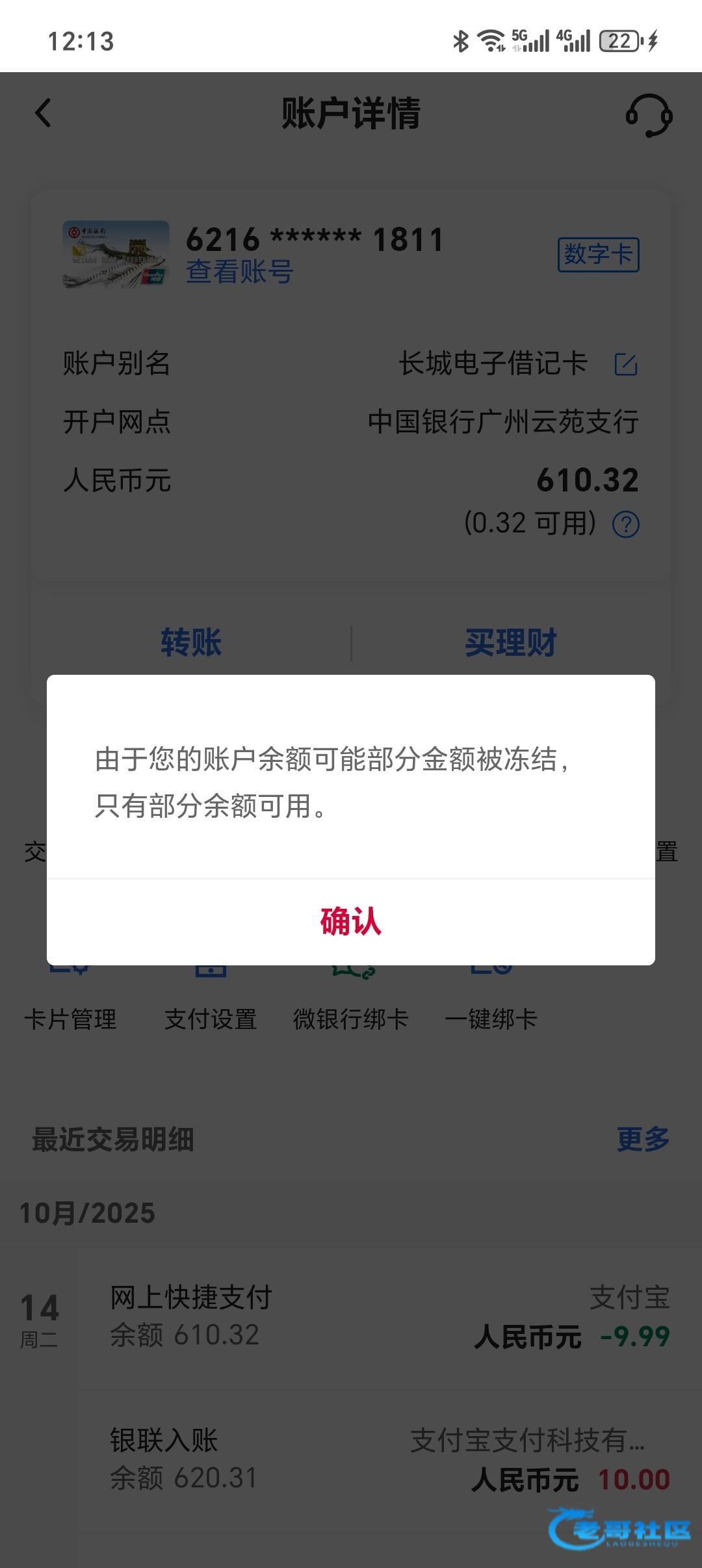 下了610下来,然后显示部分余额不可用,但是卡状态是正常的,没被冻结