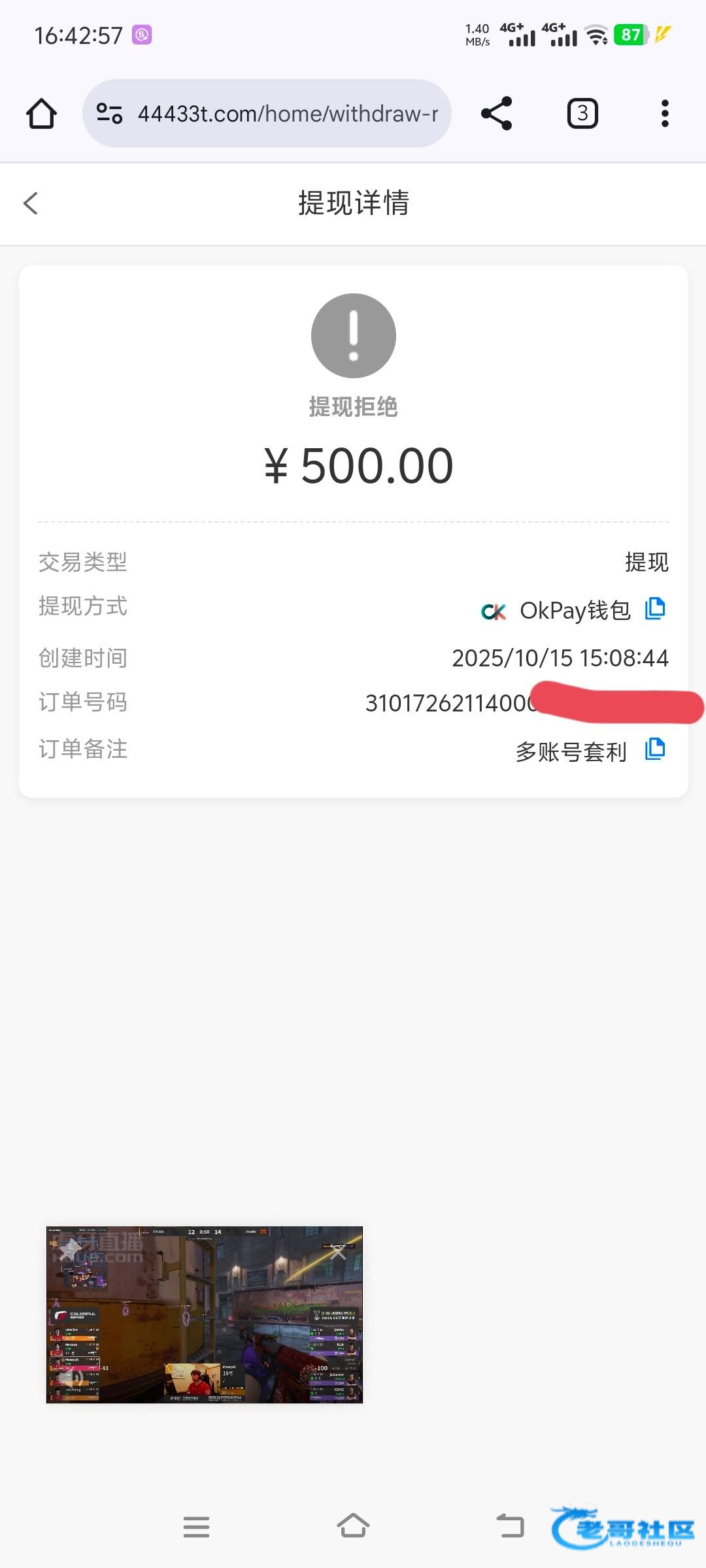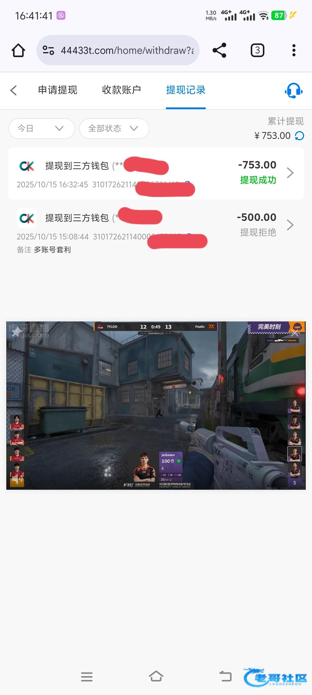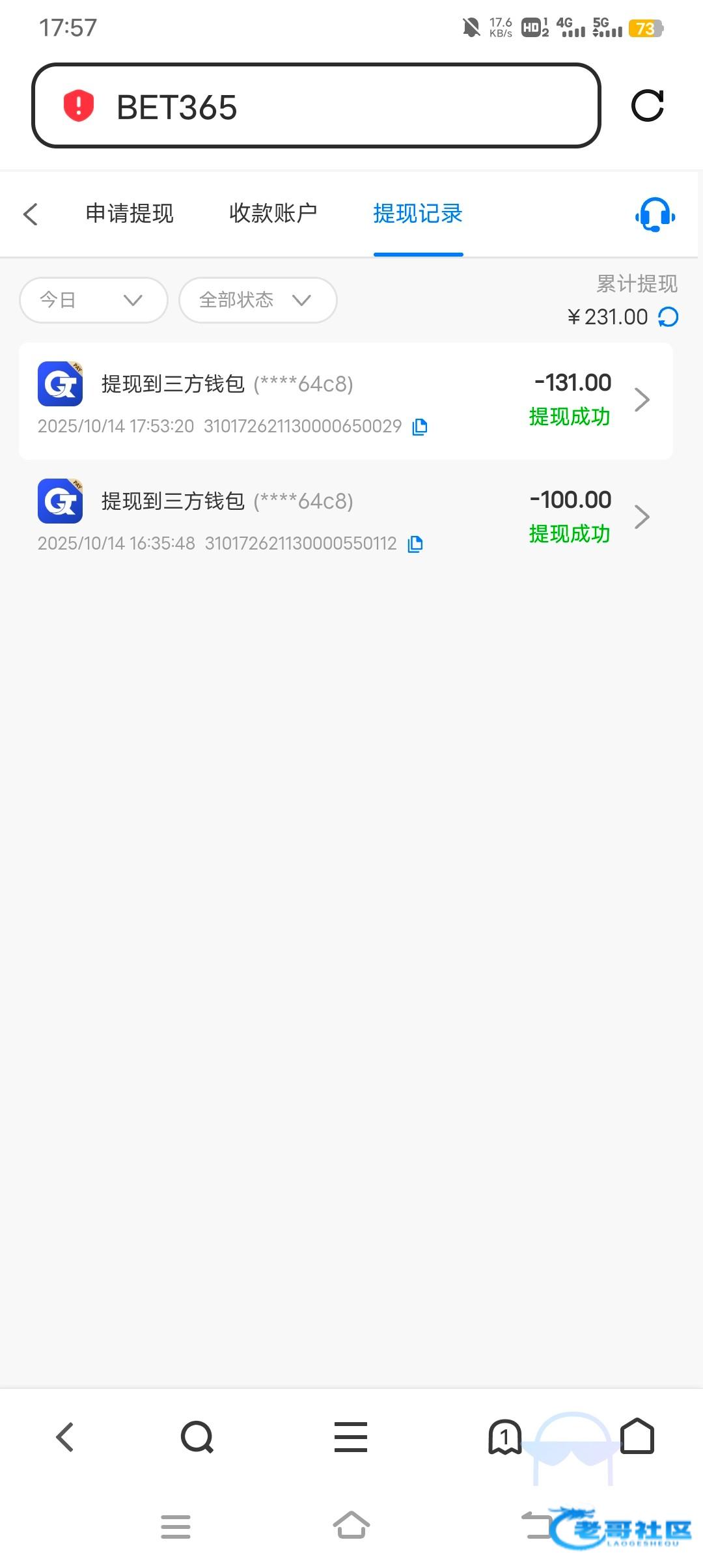 提了500等半个小时没到账,提现拒绝备注我多账号套利。去找客服问 等了10分钟之后又让我重新提交出款,提款显示要让我重新打余额的一倍流水,打完流水之后提现到账了。野鸡台还是不要充值了 老弟们