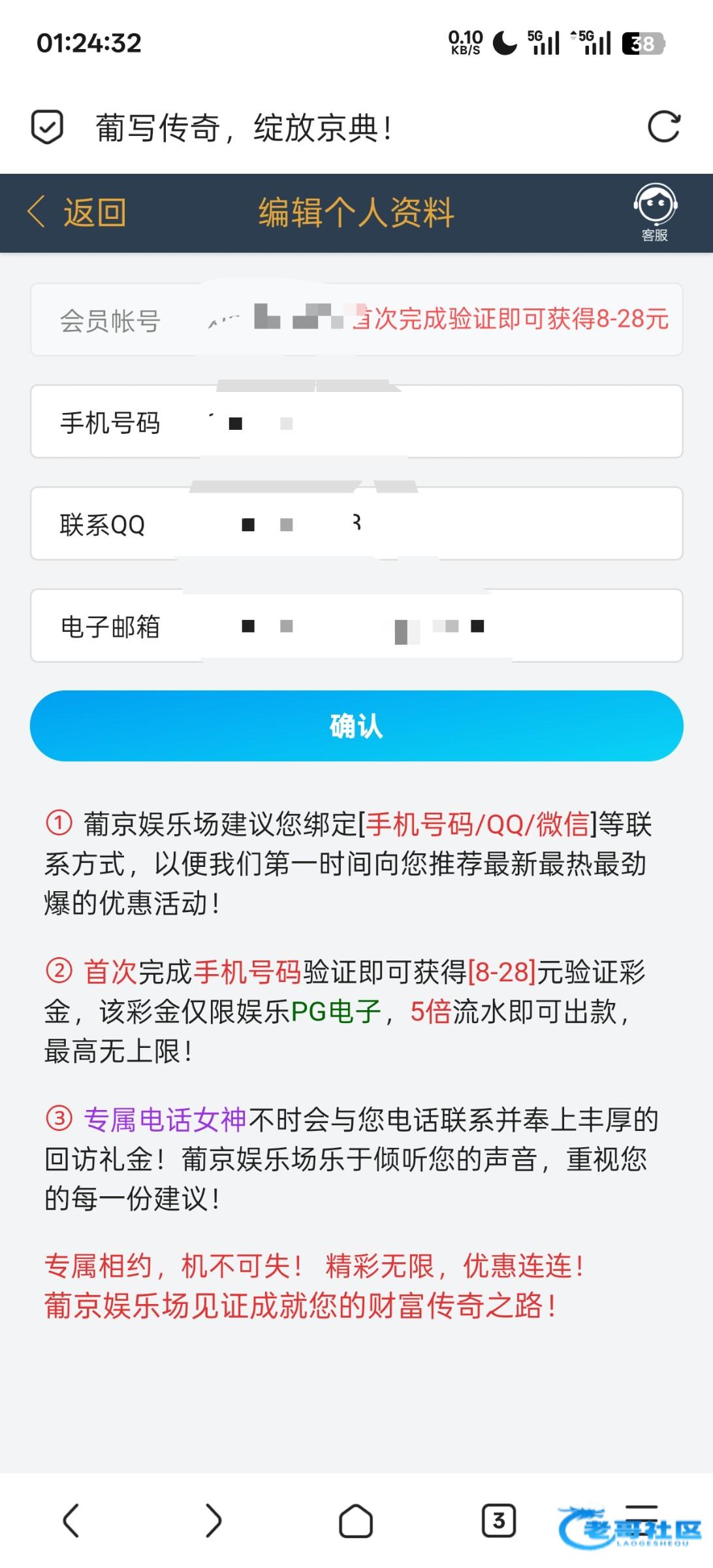 这个台子应该很多人都注册过但是没有绑定手机,新老会员都可以去试试 首次完成手机号码验证即可获得[8-28]元验证彩金,该彩金仅限娱乐PG电子,5倍流水即可出款,最高无上限! 网址http://59777.com