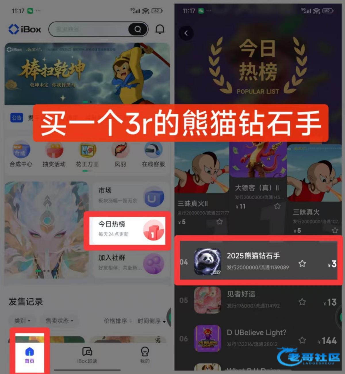 2.点首页的今日热榜买一个3块钱的钻石熊猫手。