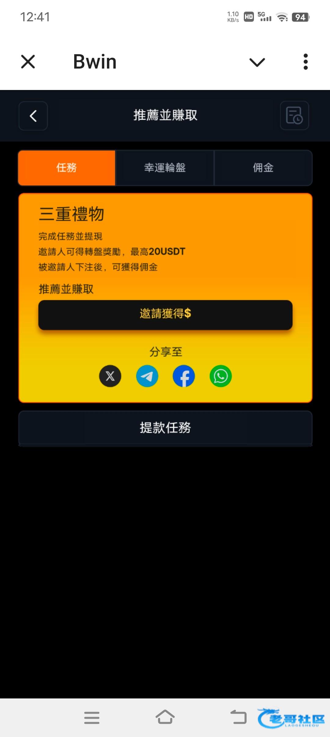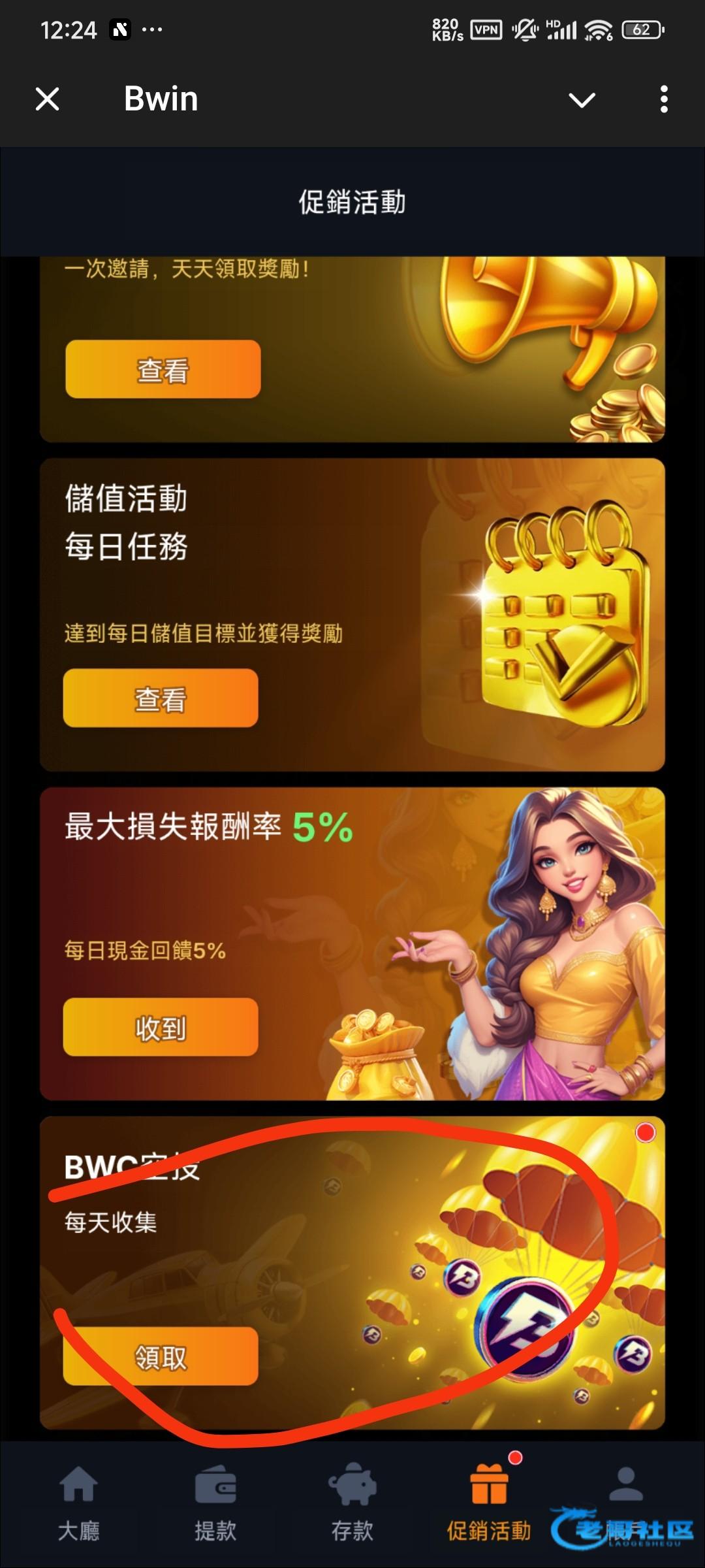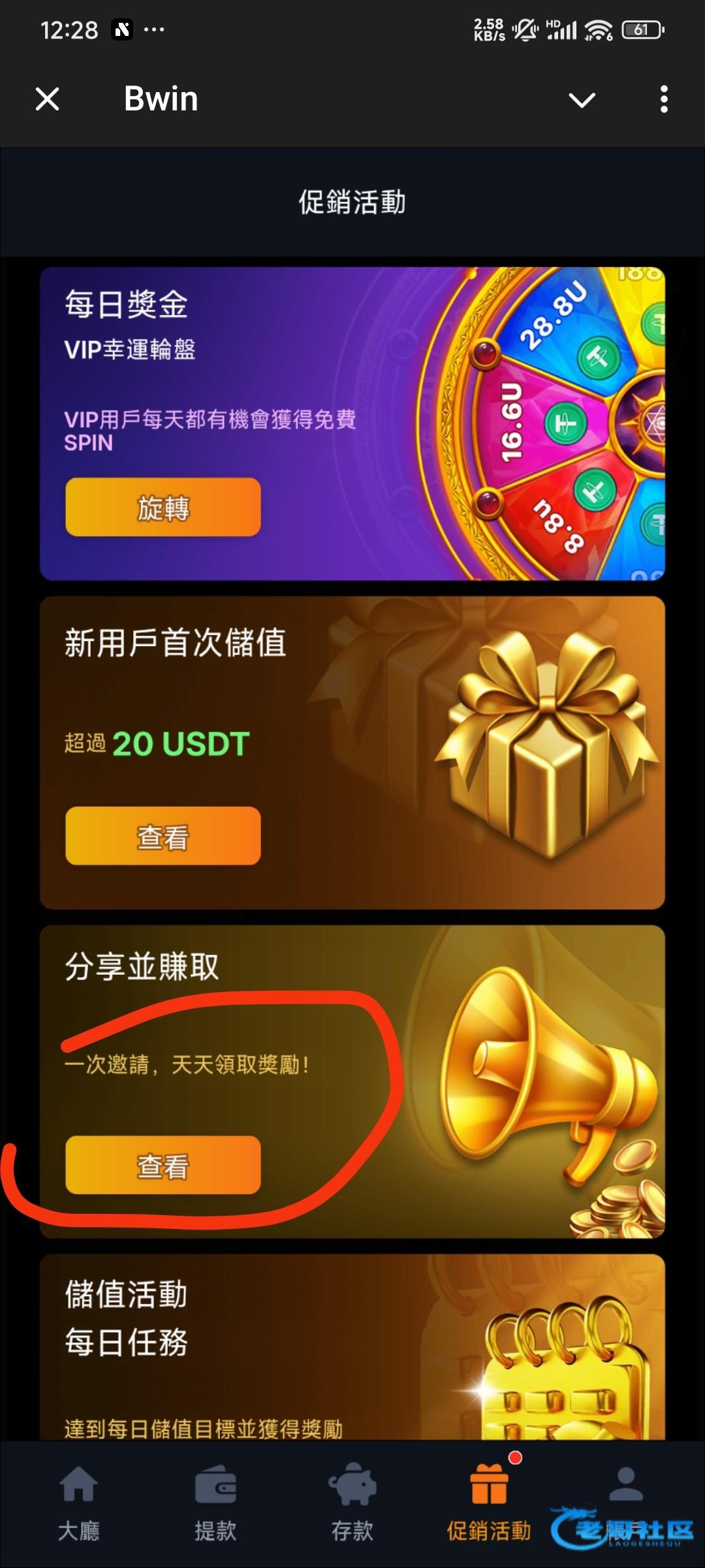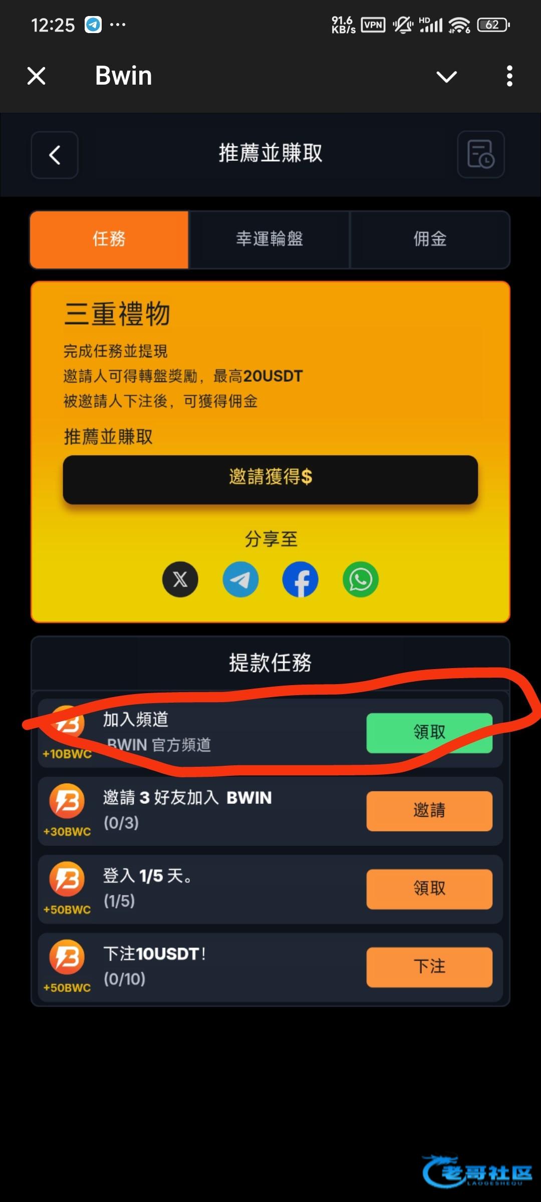 机器人@bwin,注册账号登录,点最下面促销活动,点第三个分享并赚取,然后加入频道返回领10,活动每日空投领3