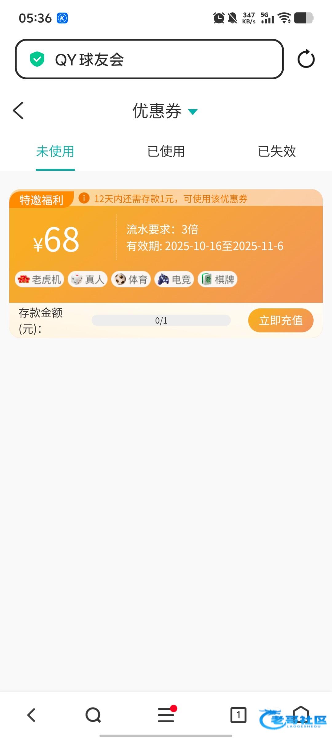 官网QYH.VIP 几个月前注册的 用电话号码登录 上去看到 充1块有个优惠券68