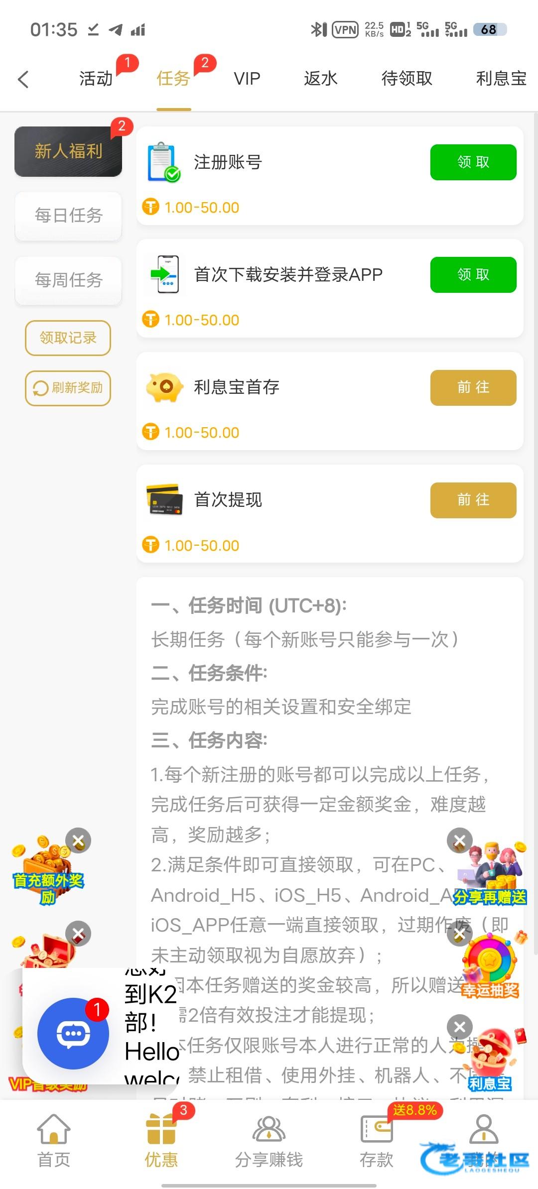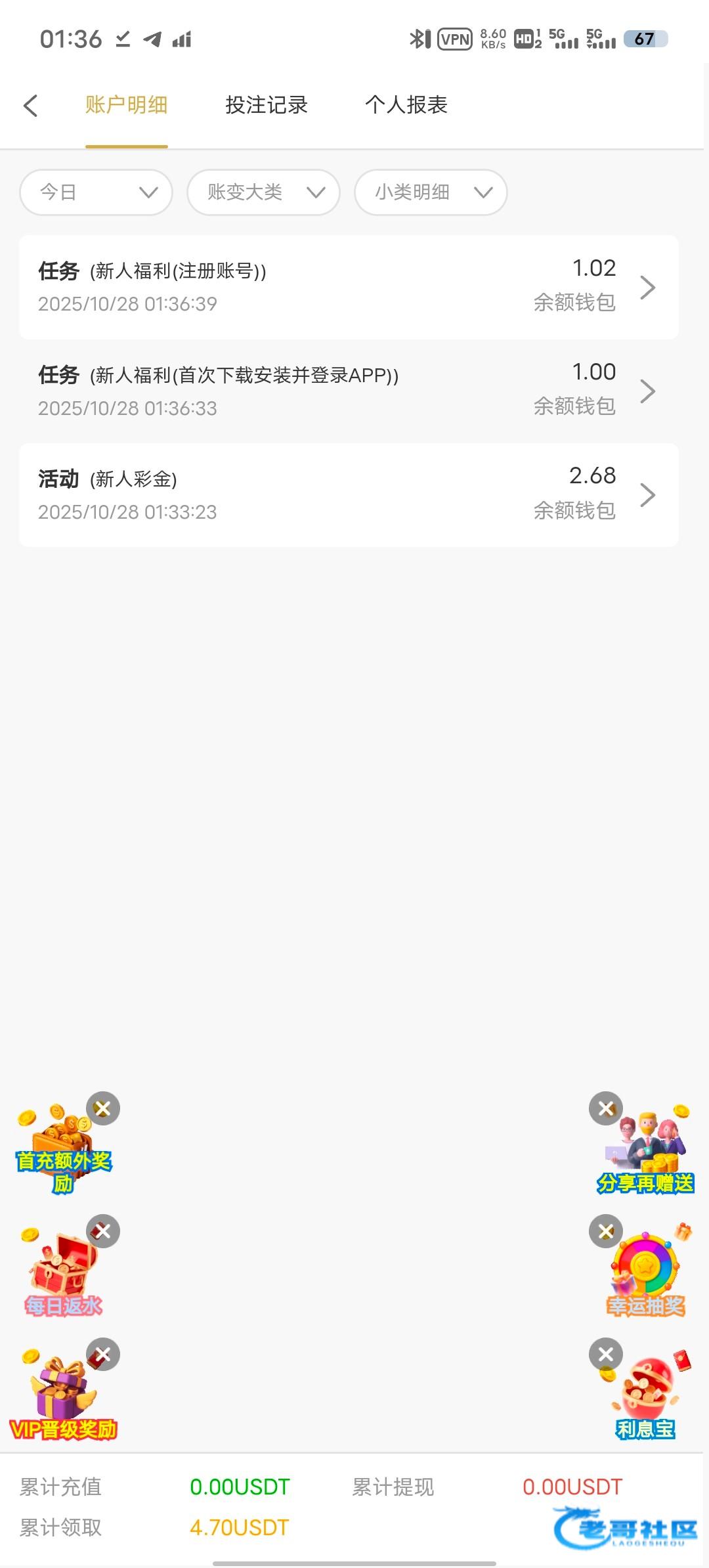 6u.ag进不去的开vpn注册+绑定地址+下载app任务中心领取大概4-5u 10u可以提现自测