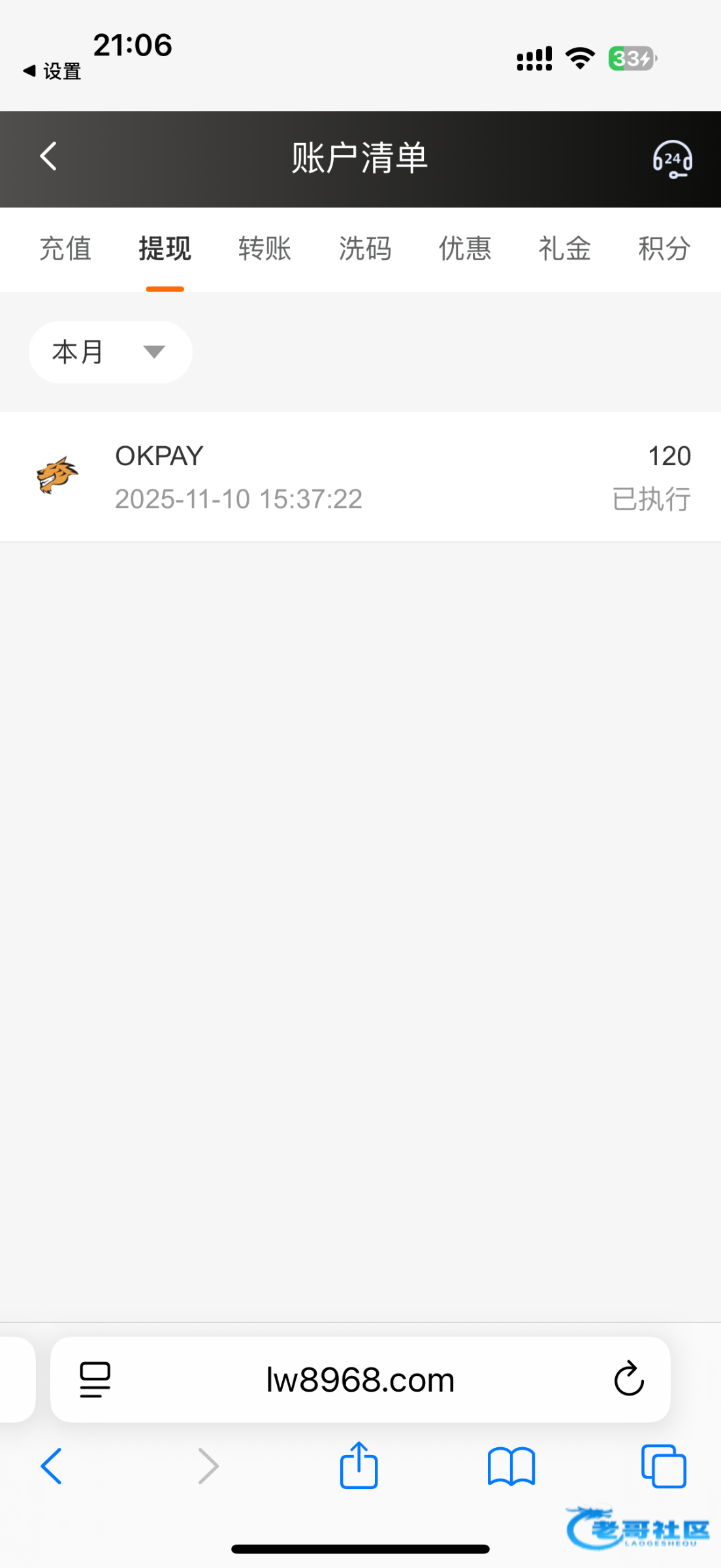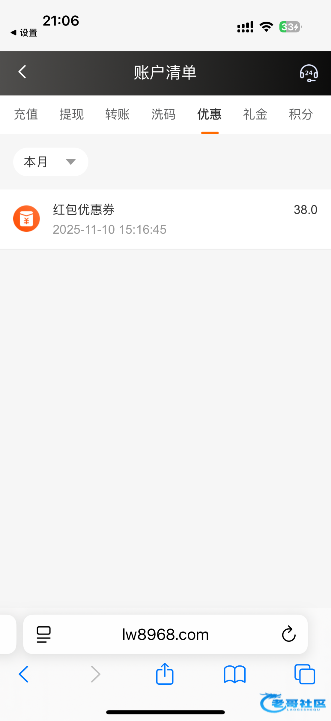 lw8968.com 前段时间看到论坛帖子说注册送21我去领了,还申请了个10+38 今天突然登陆网站发现又送了一张38的劵 存1送的,冲了15 提了120 2分钟就到账了,还行,大家注册领过彩金的可以去看看