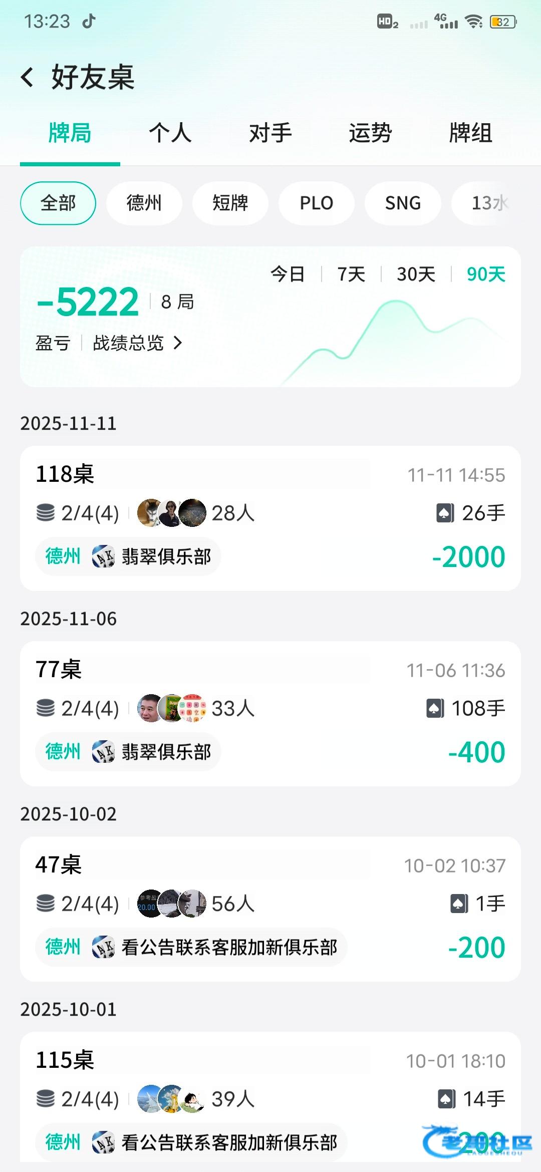 2/4的局2000分就打了26手,4000分两把牌就输没,各种冤家牌,手牌对a对k立马被河牌搞死