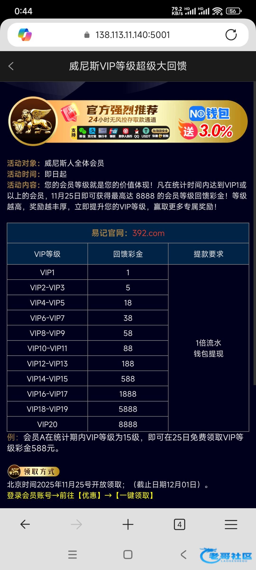 392.com和806.com,有VIP等级就可以领取,打一倍流水,最低提现10元起