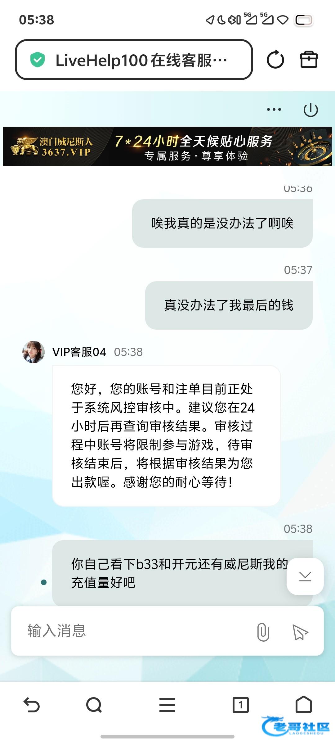 希望大家不要嘲笑我,因为这几个网虽然杀,但是不黑,我玩了三四年,都是这几个台基本上秒出的,但是我今天借了5000块钱,输到最后2000我打到了5000提现今天却卡了我,一直说什么注单系统风控审核,一开始说6点在问现在直接说24小时,我希望广大的老哥帮一下我人多力量大,不给提款的网址是3637.vip,我的账号是cheng00e,这三个平台是一起的,客服什么的都是一模一样的,要是最后没有给我出款,希望这几款平台大家都要慎重,因为我想过会输但是真的没有想过会黑,玩了几年的平台都被黑了我真的想不出来还有哪些平台可以玩,可能是网赌的末路了吧,大家帮帮我,我会给大家团饭啊,可以看我之前的帖子红了都会给大家团的,谢谢各位这个是三样聊天软件,现在b33,3637,还有开元这几个平台是一起的,如果黑了 请避雷这几个平台,我发帖是想先让广大老哥知道,给平台压力。没办法了我也不想但是我借的5000最后的5000了,谢谢各位,判官苏苏审核求求了