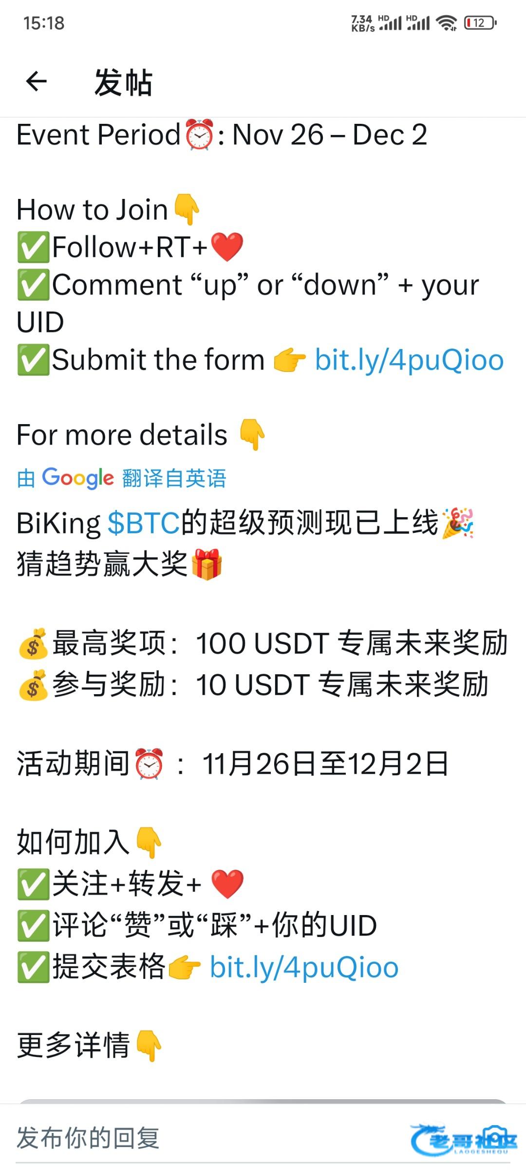 https://docs.google.com/forms/d/e/1FAIpQLScy78Rc2TWGNkLywyTFmxEVx0Gjg302XH4IciWxzcWLkua7-Q/viewform提交这个表格,无头,需要挂梯子,猜涨跌,猜对了以后第三天到,比如今天提交涨,明天0点后核实结果正确错误,猜对以后第三天100u赠金到账,随便找个币做空或者多,拉个10倍杠杆很快,吃到100u的不少,我看论坛没人发我就发了,每天都可以参加币王https://www.666401.com/v3/user/download下载地址