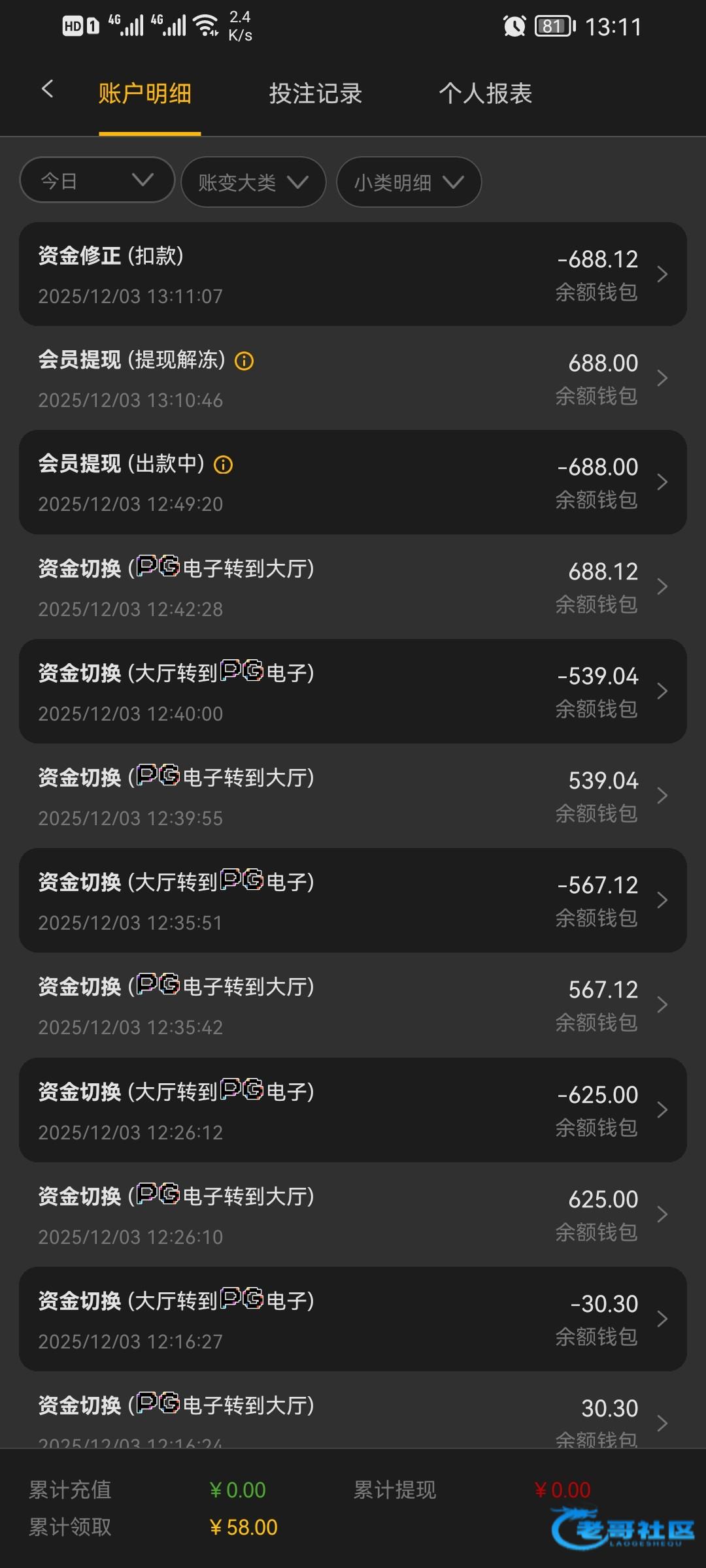 打到800,账号留120提688被扣款了,余额120也清空了,藏了两把免费也清零了,返水没清空,反手充20把返水领了,去pg拉两把就进免费,提300到了,后面来的建议多打点流水吃返水