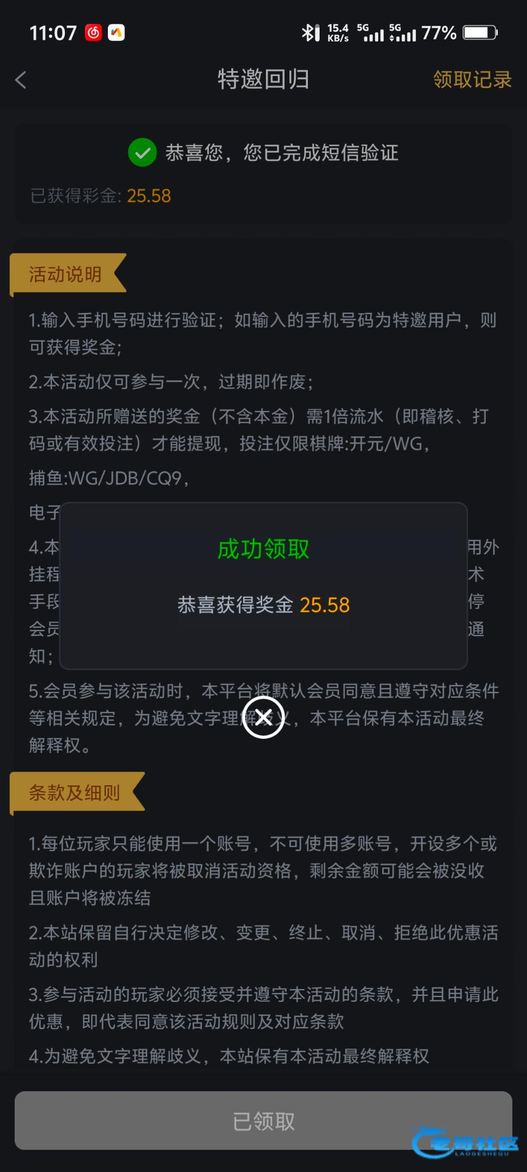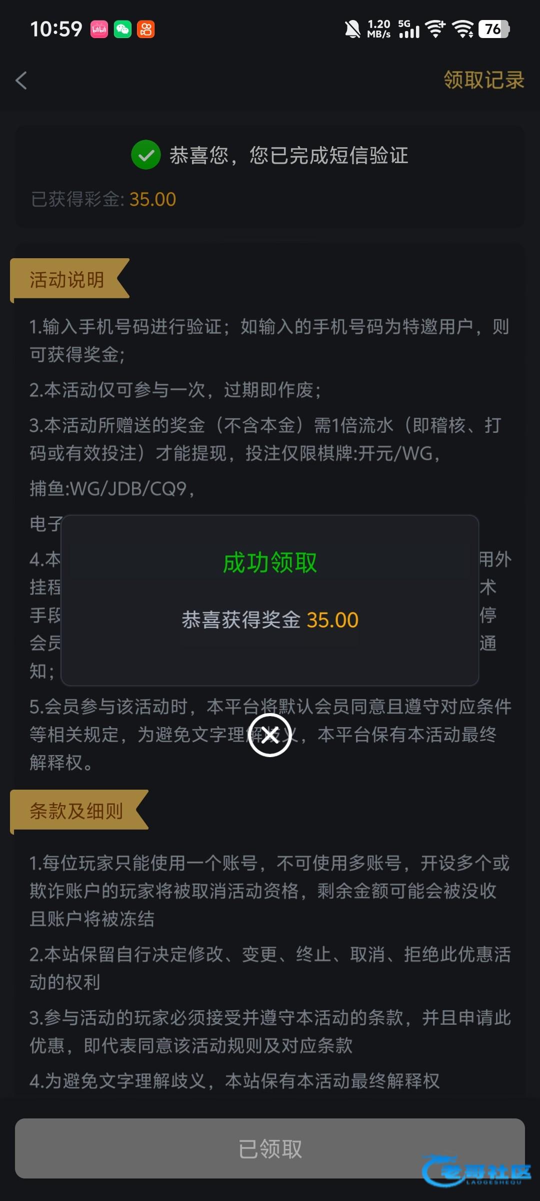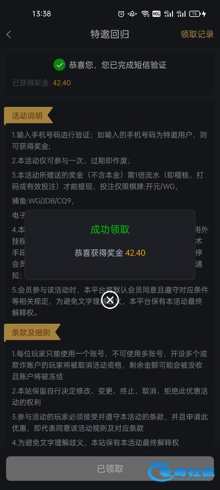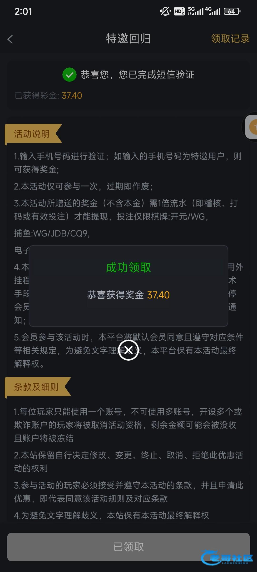 领了个回馈彩金20
