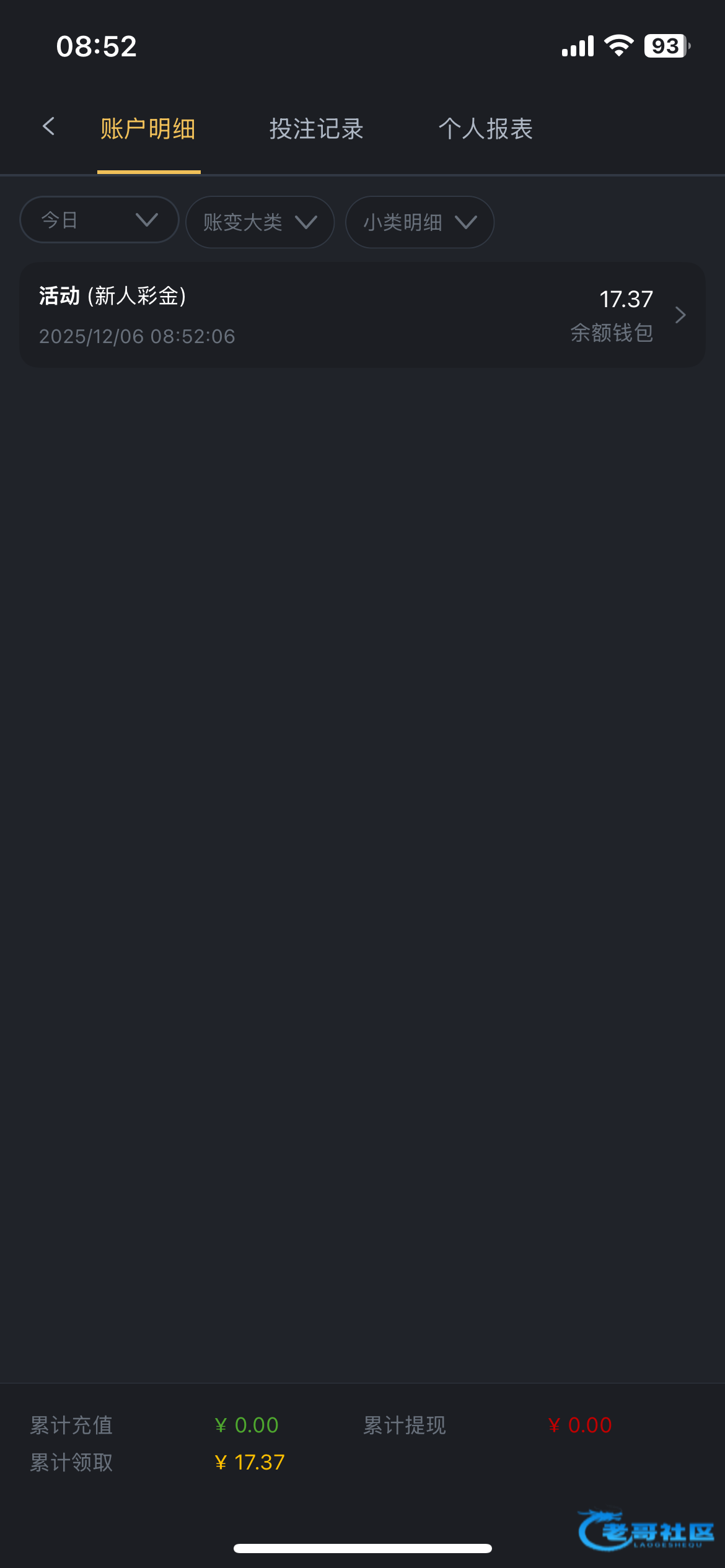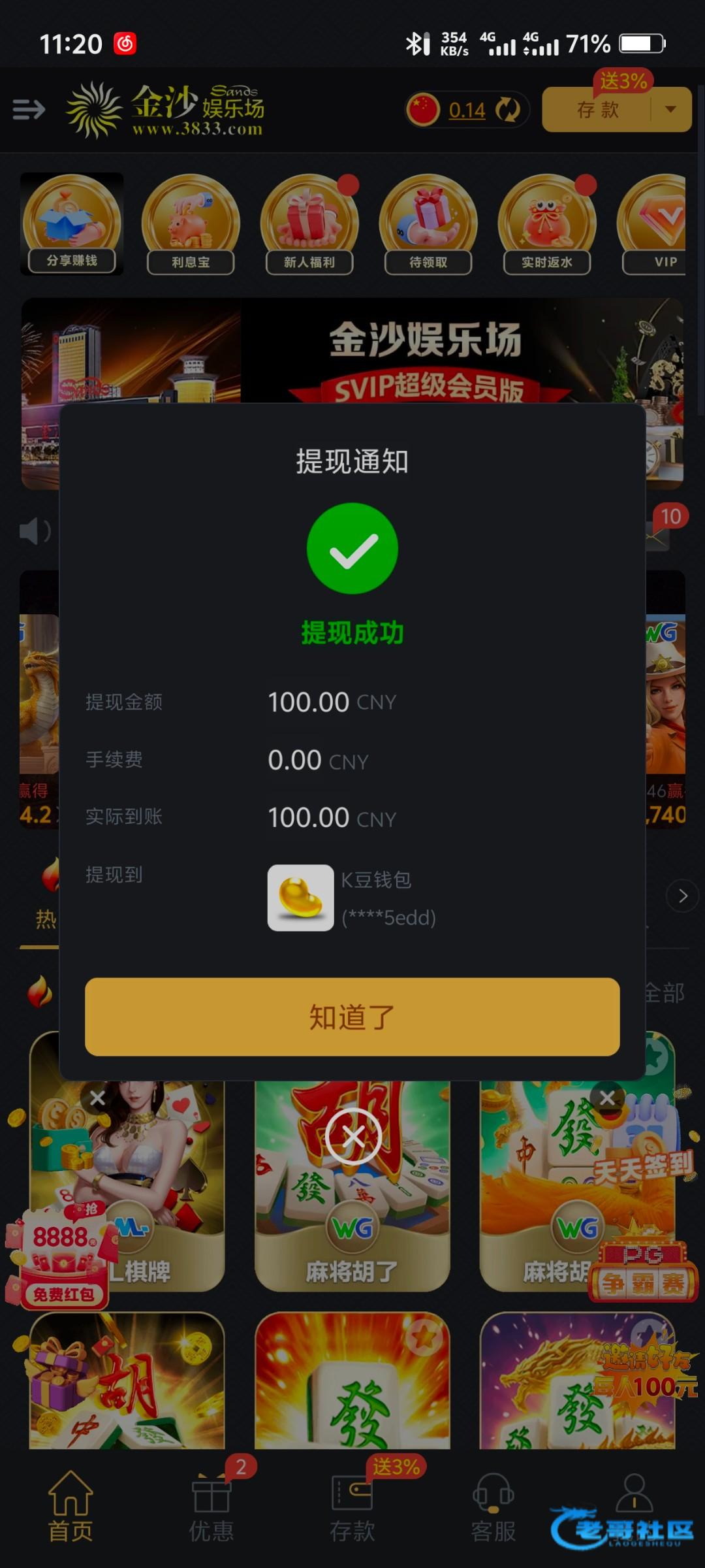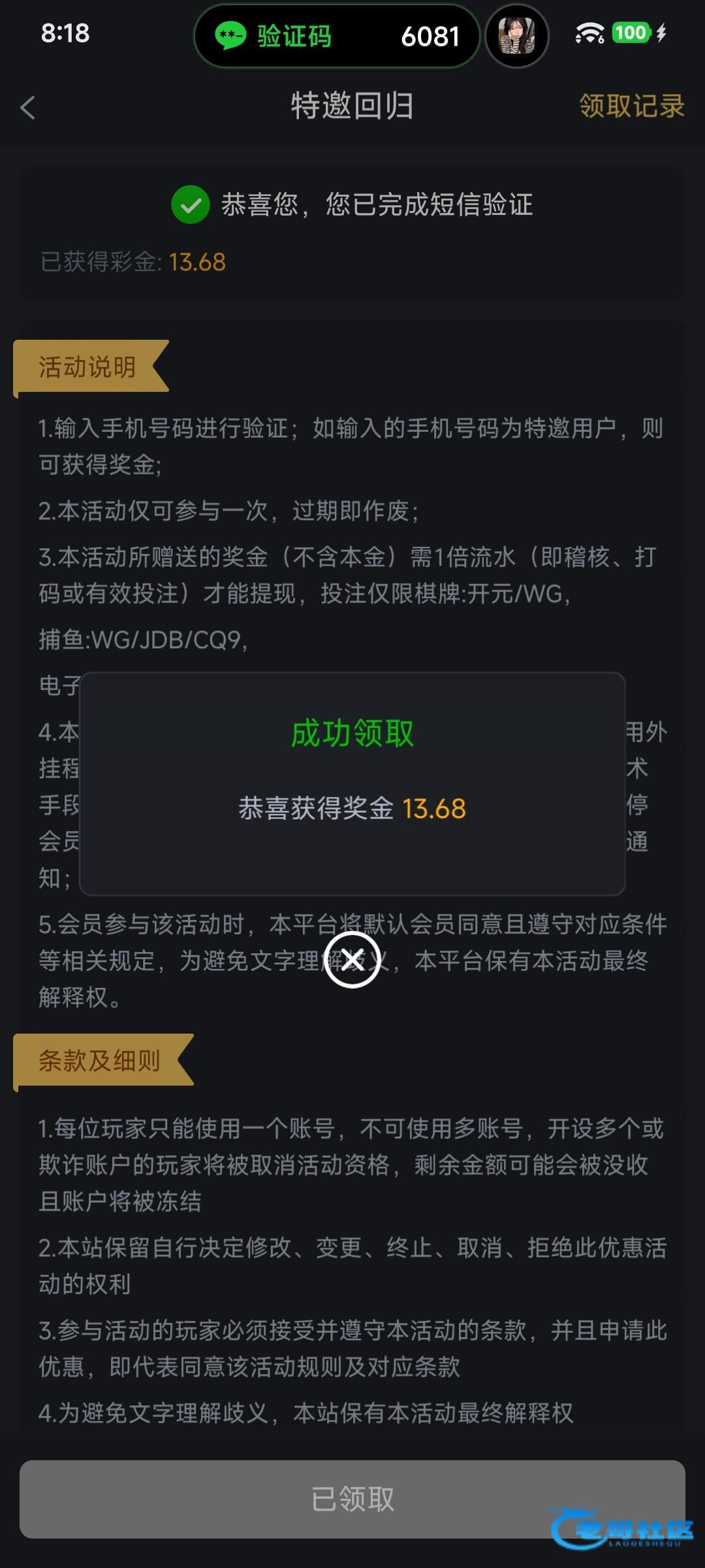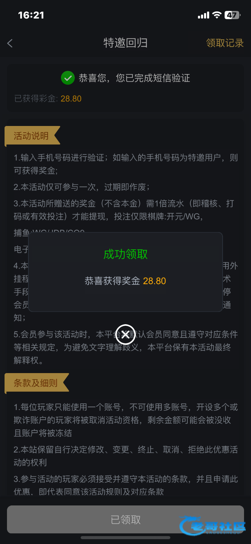 领了个回馈彩金20