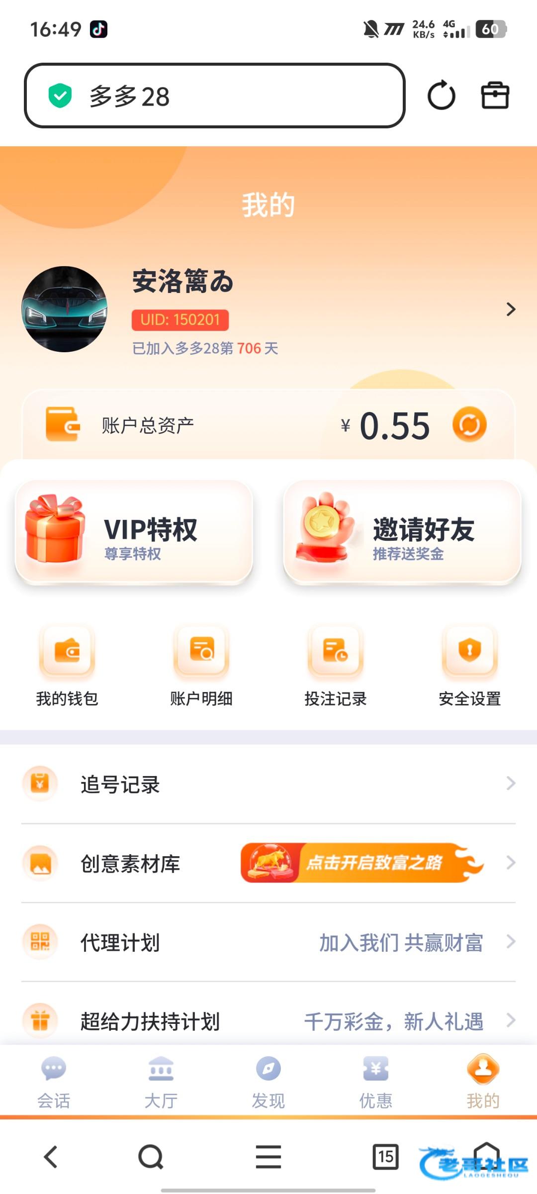 来老哥网一年多了,每次看见别人发的白嫖帖子都点进去看看,记得第一次注册老哥网的时候还是在pop聊天软件上看的,这一年在老哥网有时候赢有时候输 总是一句话支持老哥,认准老哥就行老哥靠谱,